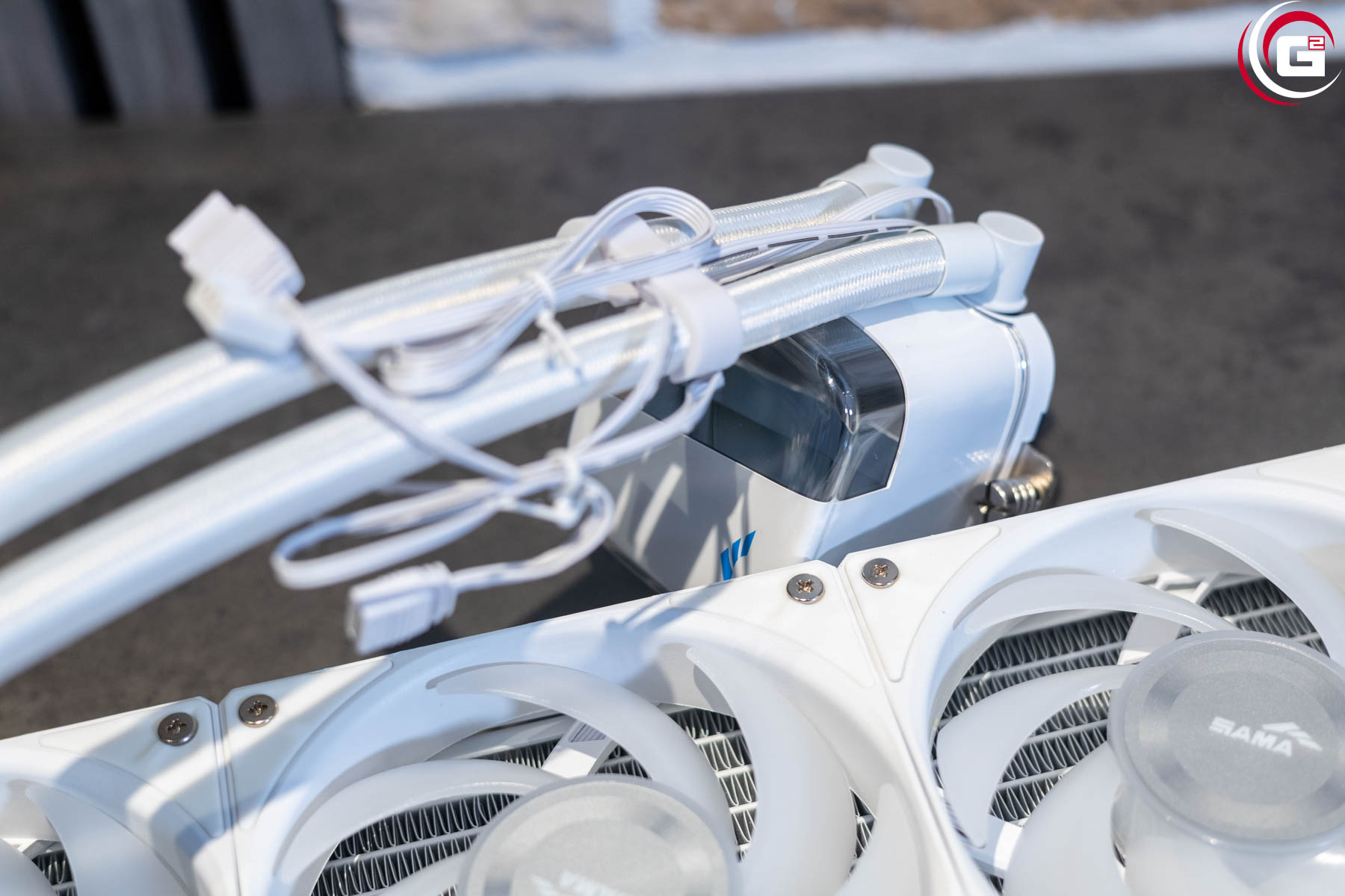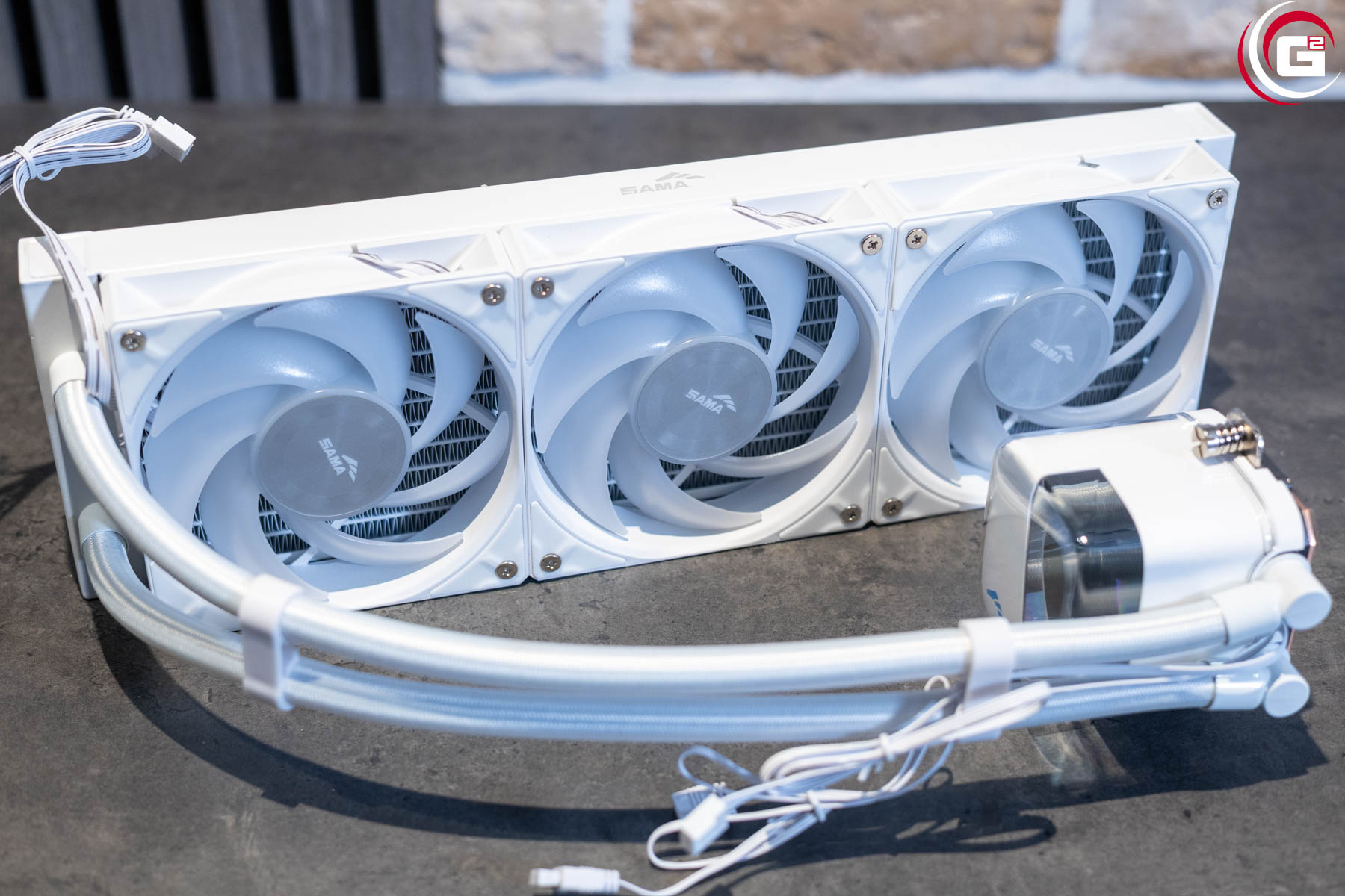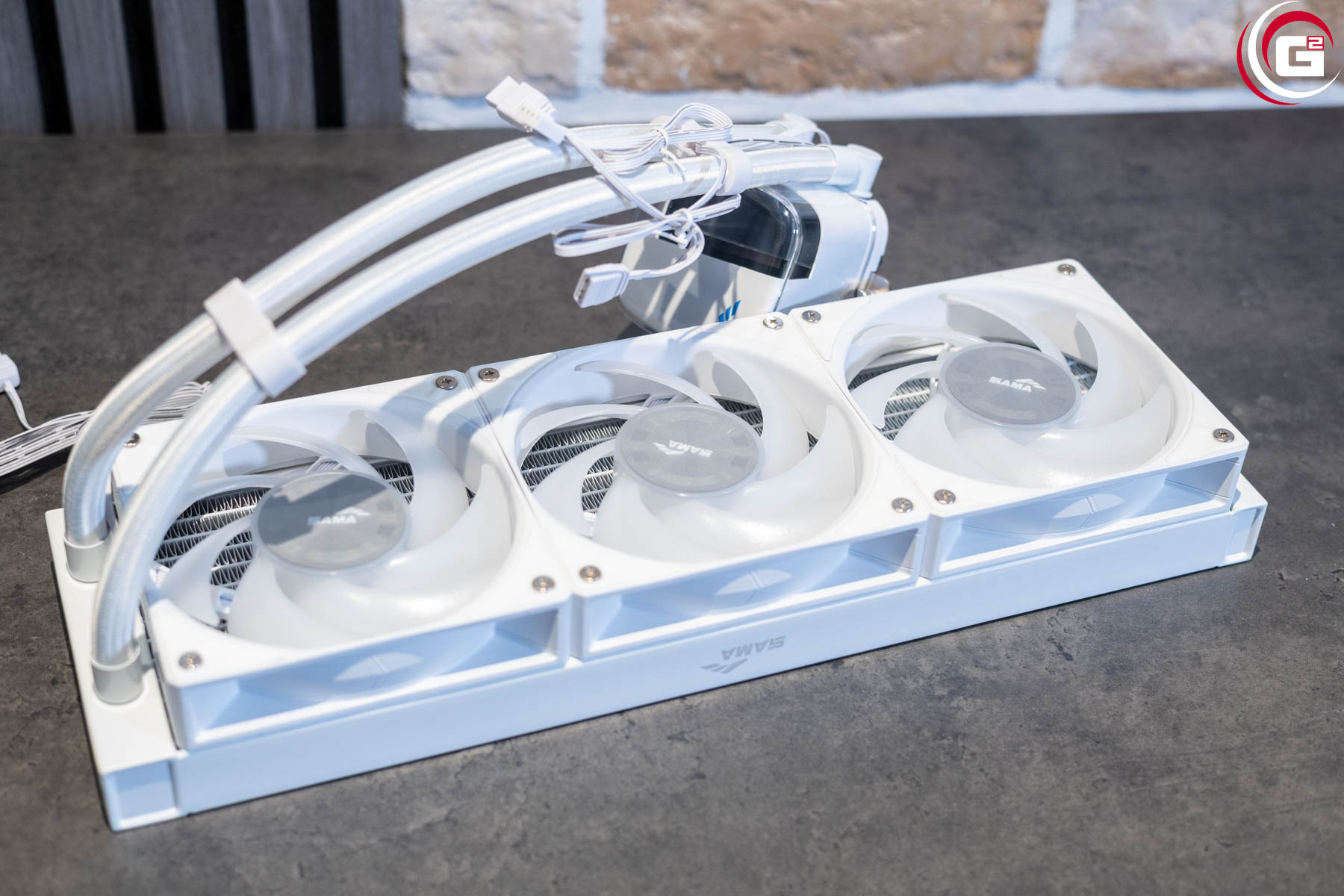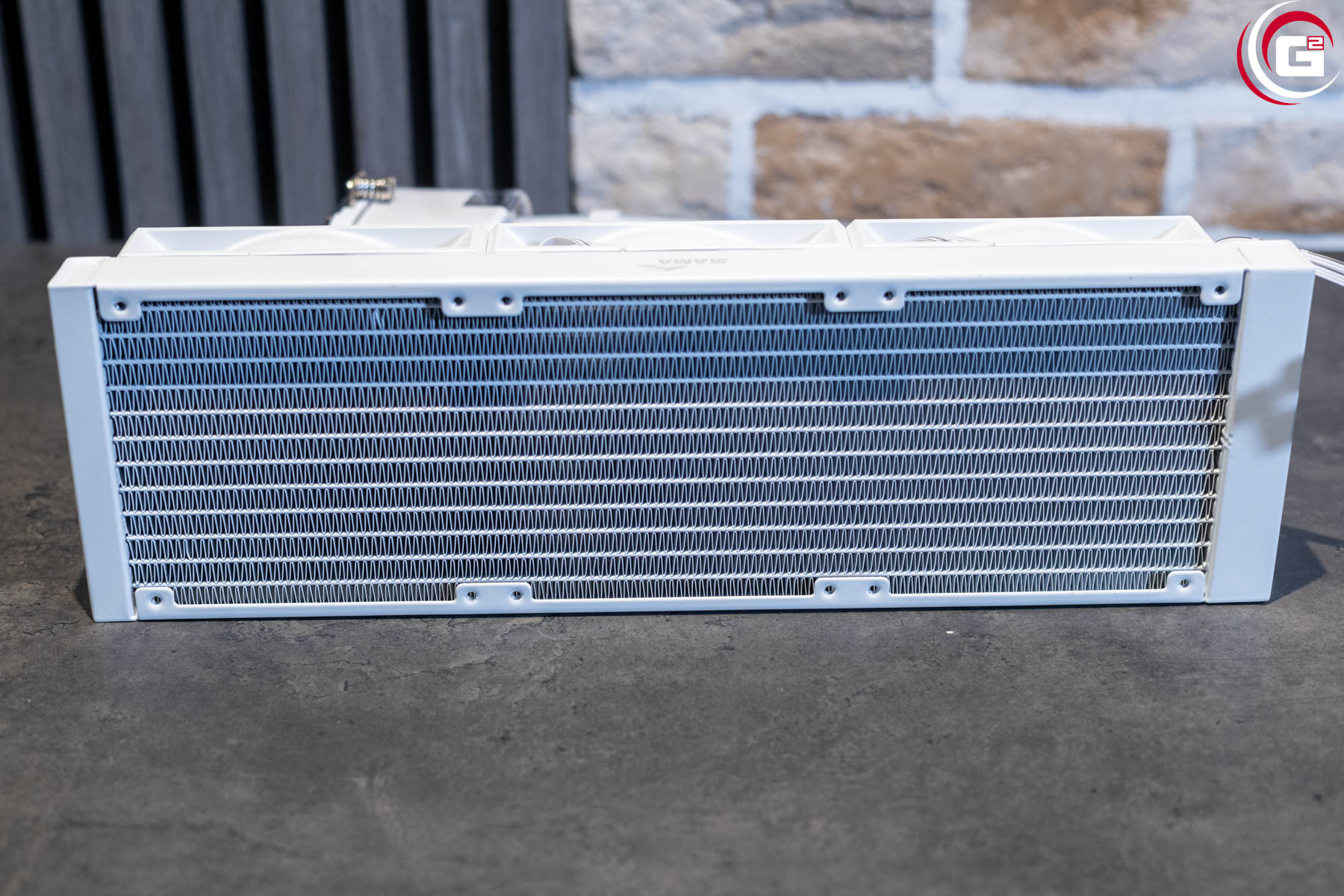 Die SAMA L70 360 mm wird vollständig vormontiert geliefert und besitzt ein klassisches AiO-Design mit rechteckigem Radiator und aufgesetzten Lüftern. Bei unserem Testmuster handelt es sich um die weiße Ausführung der AiO. Das Aluminiumgehäuse des Radiator besitzt eine gleichmäßige Farbgebung und saubere Verarbeitung. Die Lamellen sind gleichmäßig ausgebildet und geformt.