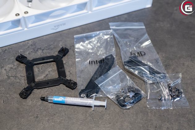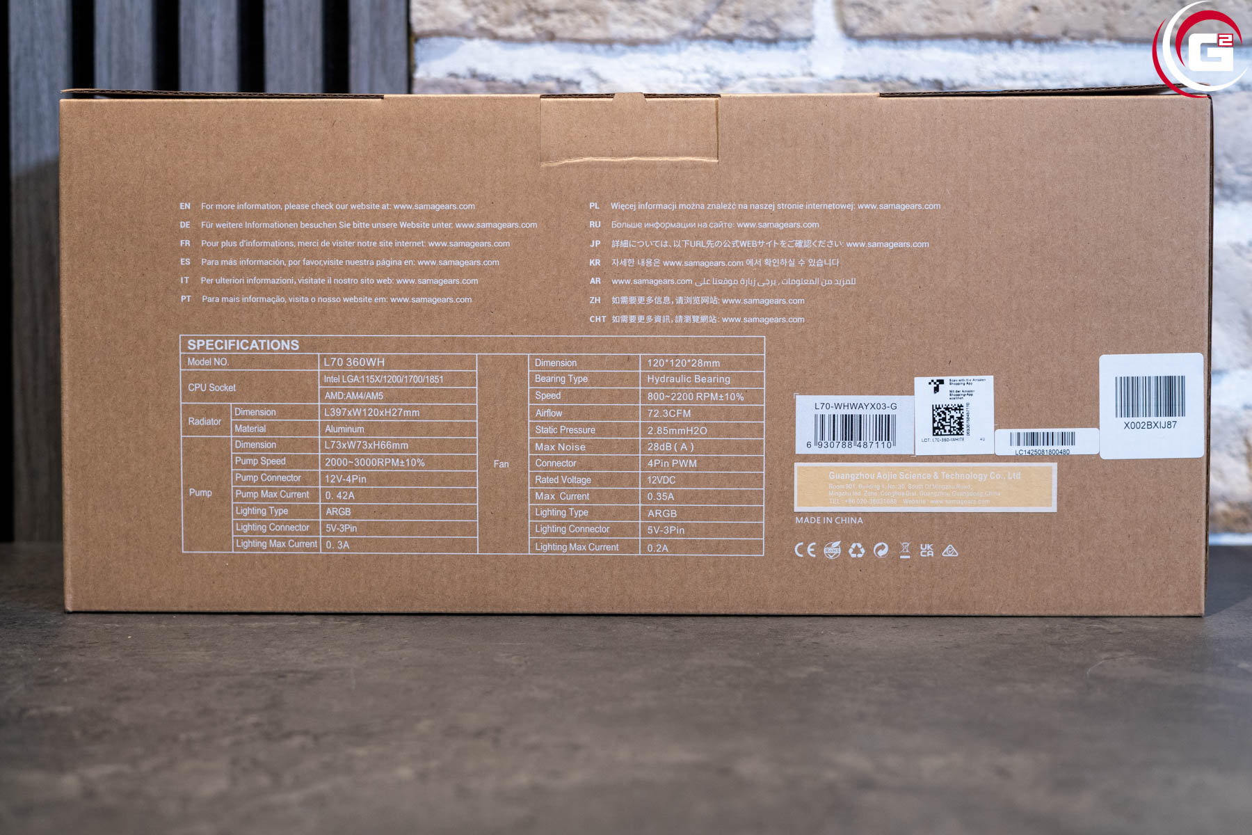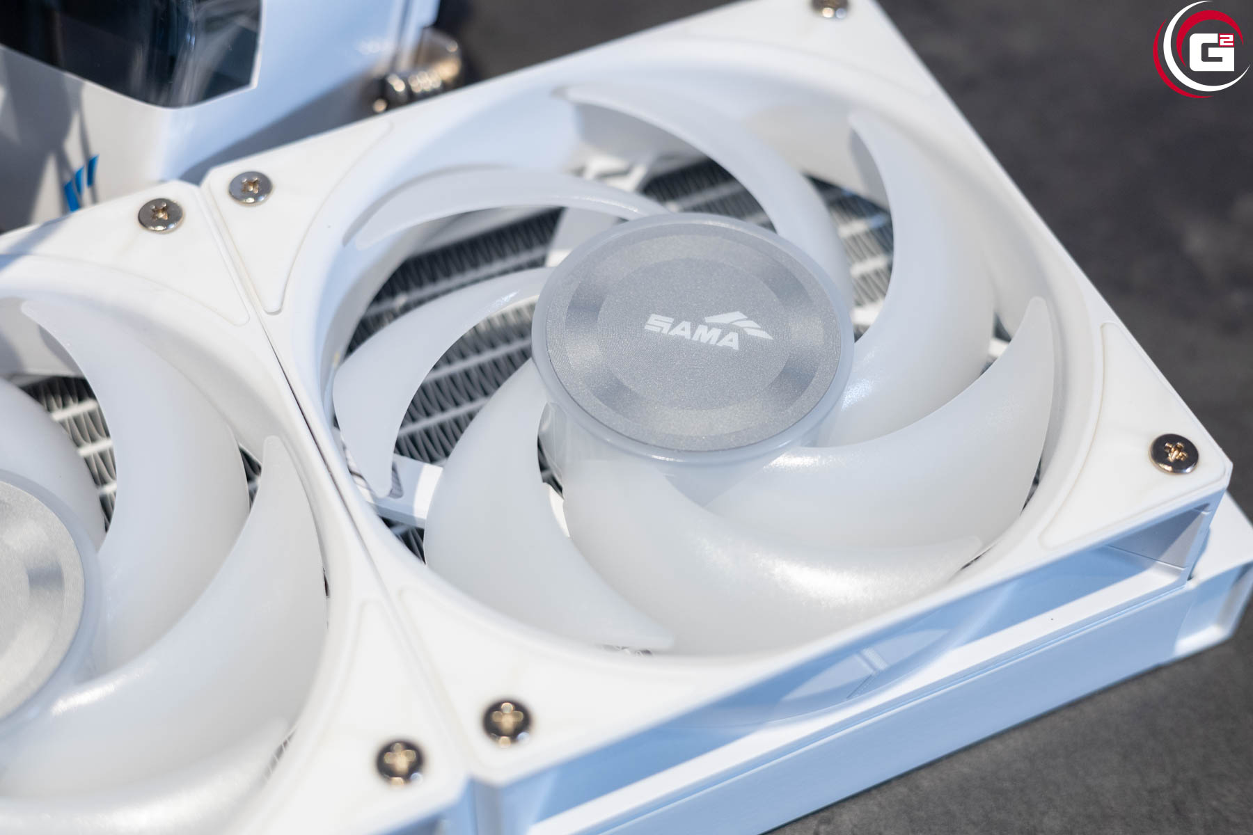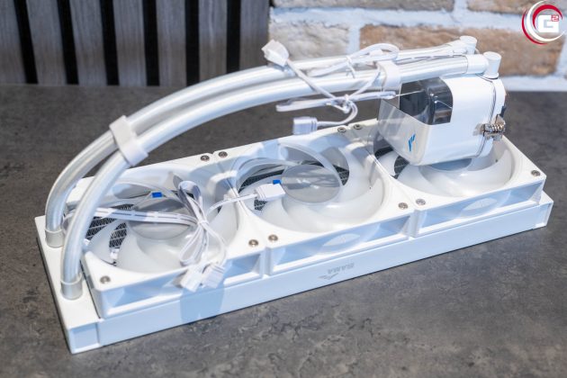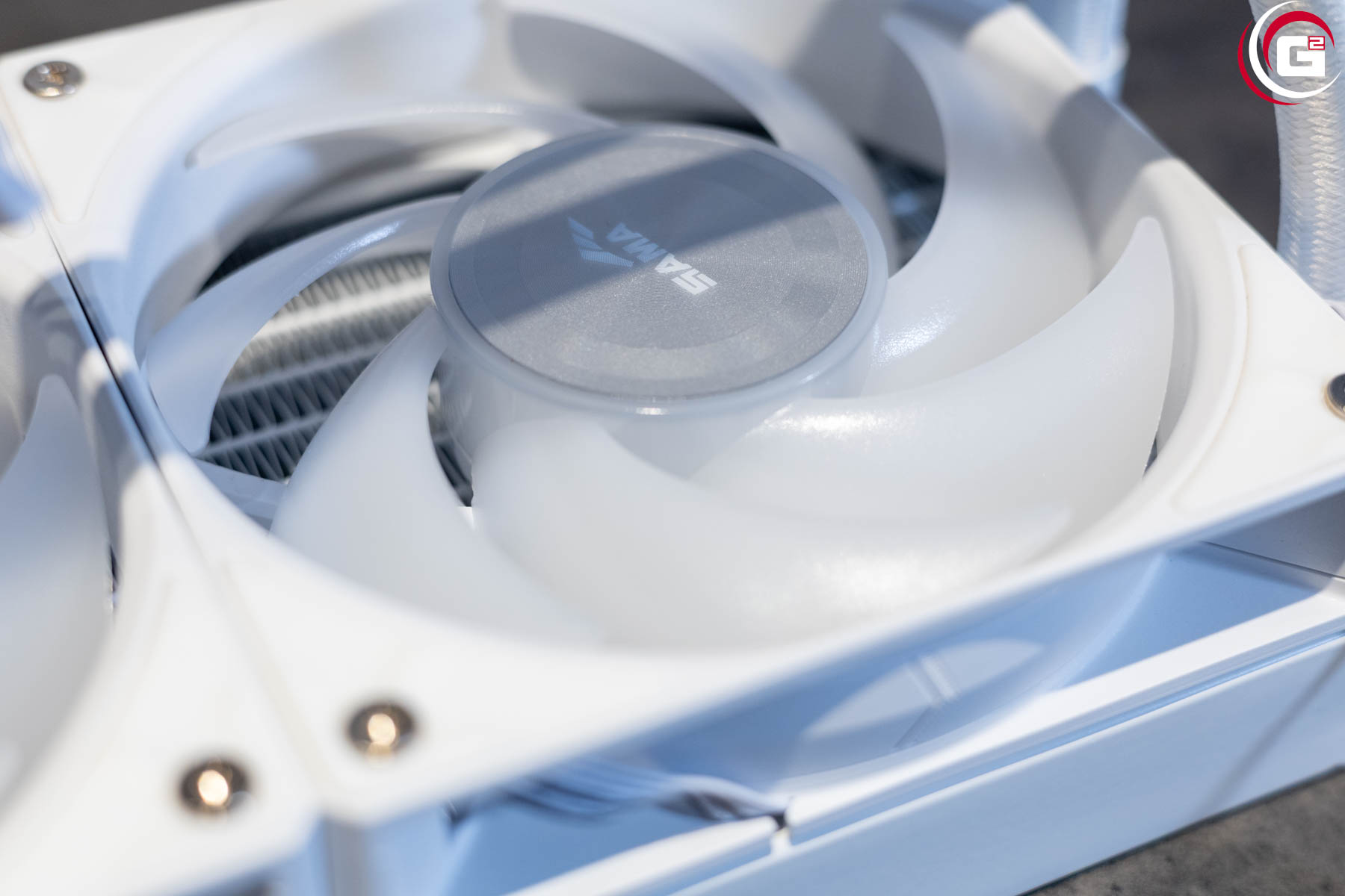 Die SAMA L70 360 mm wird vollständig vormontiert geliefert und besitzt ein klassisches AiO-Design mit rechteckigem Radiator und aufgesetzten Lüftern. Bei unserem Testmuster handelt es sich um die weiße Ausführung der AiO. Das Aluminiumgehäuse des Radiator besitzt eine gleichmäßige Farbgebung und saubere Verarbeitung. Die Lamellen sind gleichmäßig ausgebildet und geformt.
