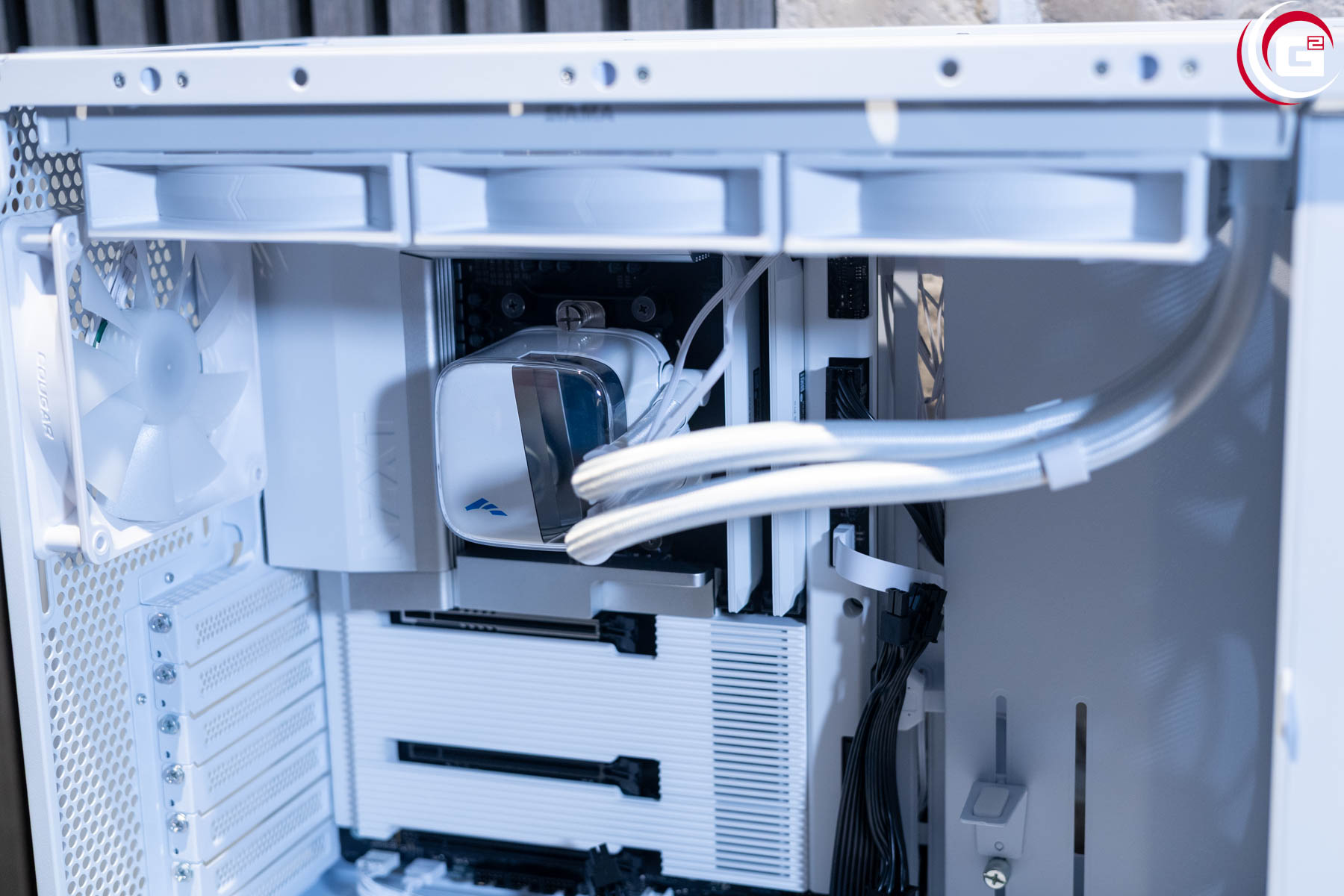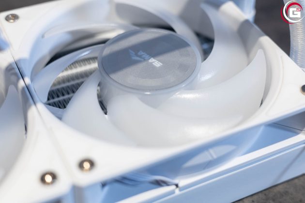 Der Rahmen der Lüfter ist ebenfalls in Weiß ausgeführt, ebenso die Kabel. Der Rotor besitzt eine Nabenabdeckung aus gebürstetem Aluminium und einen Rotor aus einem milchig, transparentem Kunststoff. So kann sich das Licht der integrierten ARGB-Beleuchtung gleichmäßig ausbreiten.