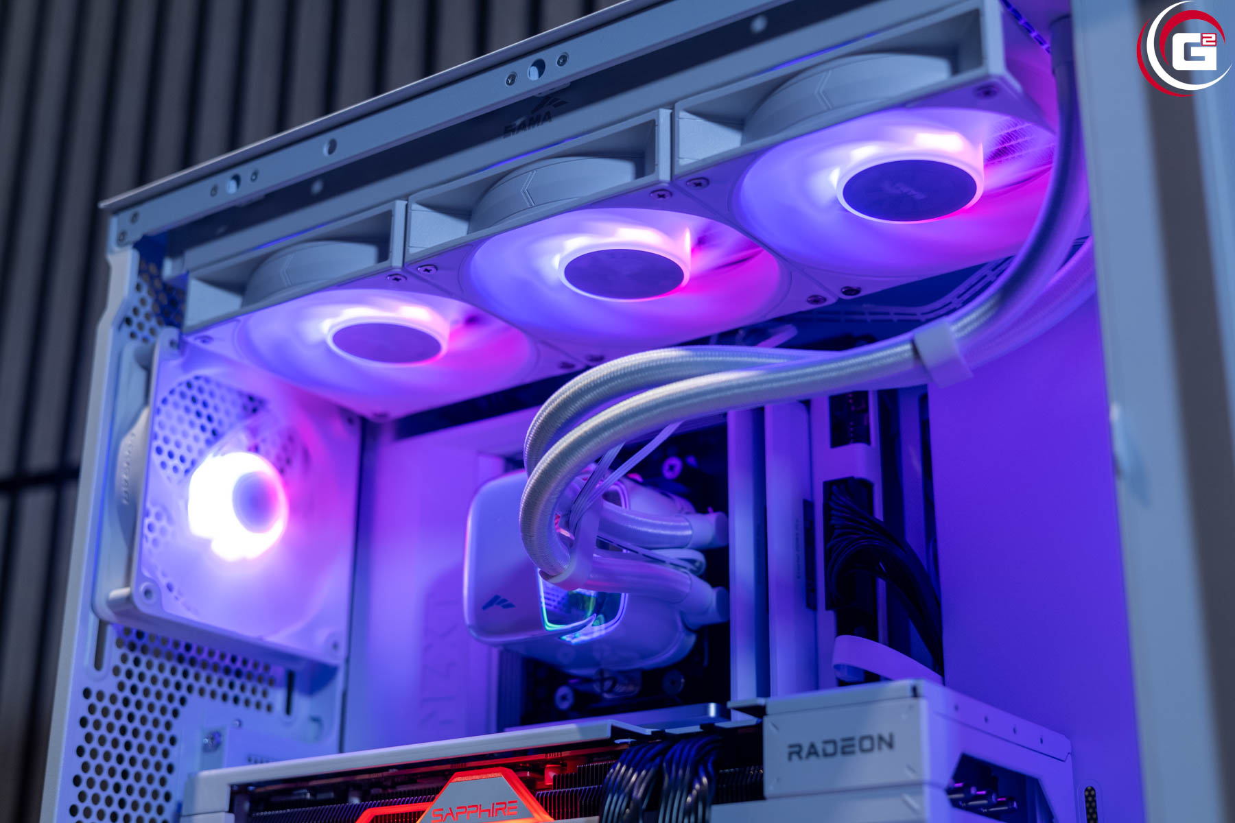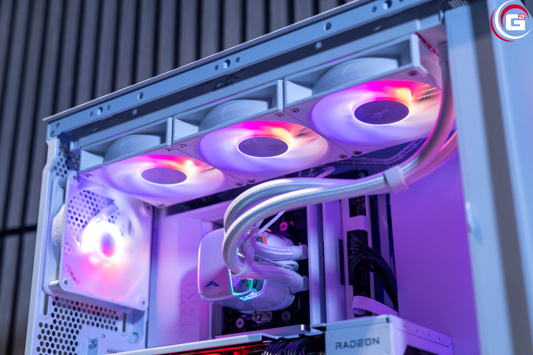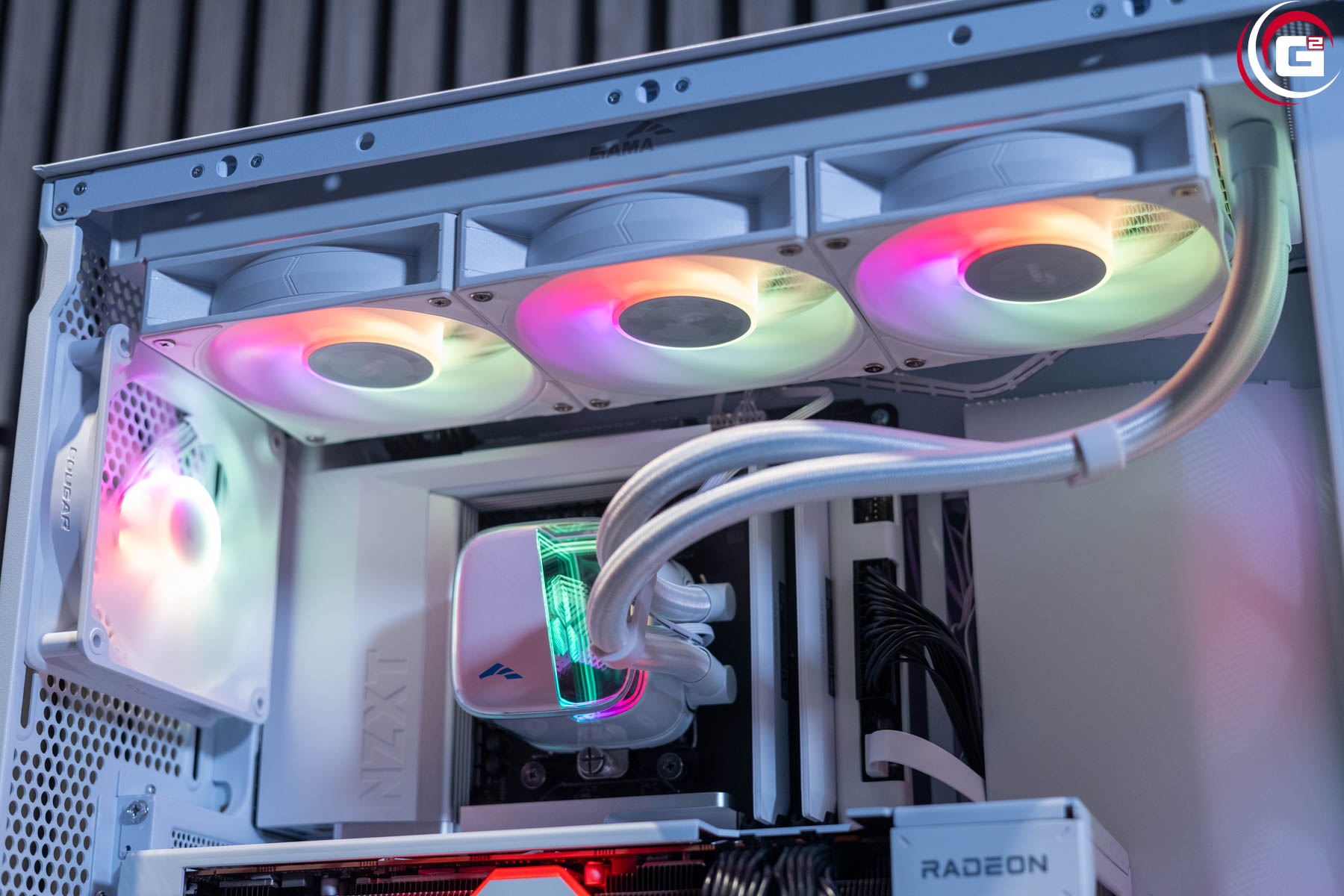 Ein weiterer Pluspunkt sind die drei bereits vormontierten 28-mm-ARGB-Lüfter mit Hydrauliklagern. Sie liefern einen hohen statischen Druck von 2,85 mmH₂O und einen Luftdurchsatz von 72,3 CFM, wodurch sie sich optimal für den Einsatz auf Radiatoren eignen. Mit einem Drehzahlbereich von 800 bis 2200 U/min (±10 %) decken sie ein breites Leistungsspektrum ab, von leisen Alltagsanwendungen bis hin zu maximaler Kühlleistung unter Volllast. Dabei bleibt die Geräuschentwicklung mit bis zu 28 dBA angenehm kontrolliert.