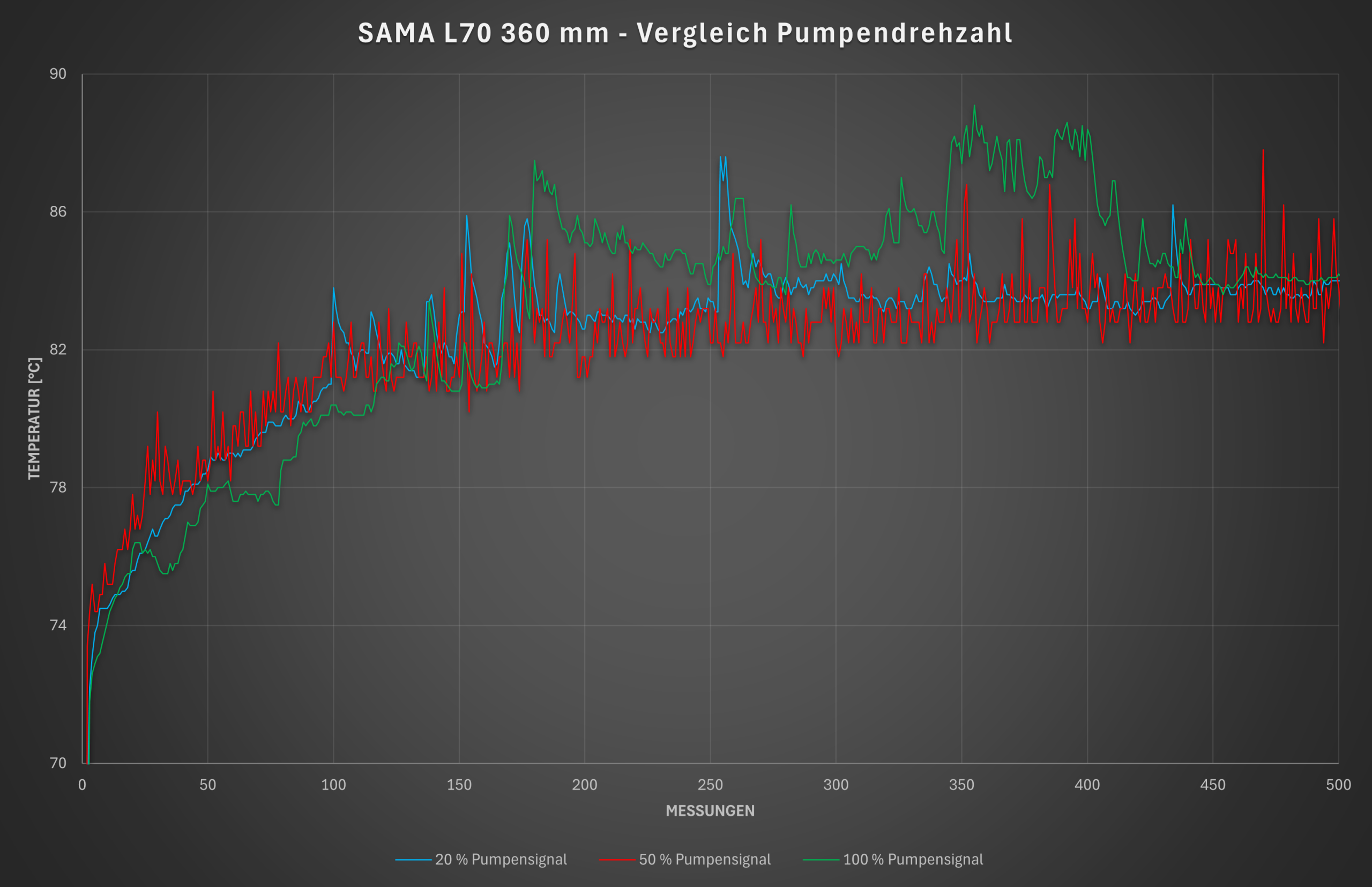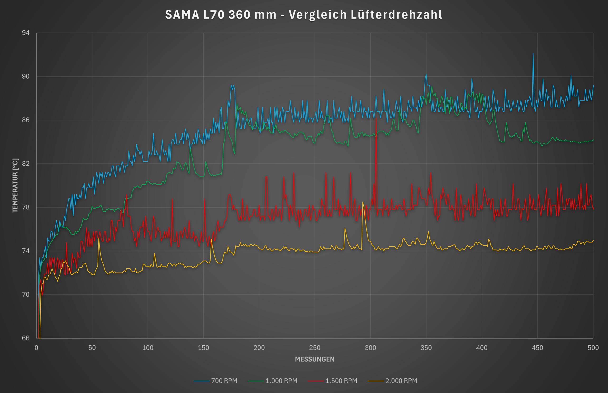 Die SAMA L70 360 mm zeigt eine gute Kühlperformance. Der Unterschied zwischen einer Drehzahl von 2.000 RPM und 1.500 RPM liegt bei etwa 4 °C, hier kann man bei geringen thermischen Einbußen einen guten akustischen Vorteil mitnehmen. Die Temperaturen bei 700 und 1.000 RPM liegen dicht beieinander und zwischen 1.000 RPM und 1.500 RPM liegen etwa 6 °C.