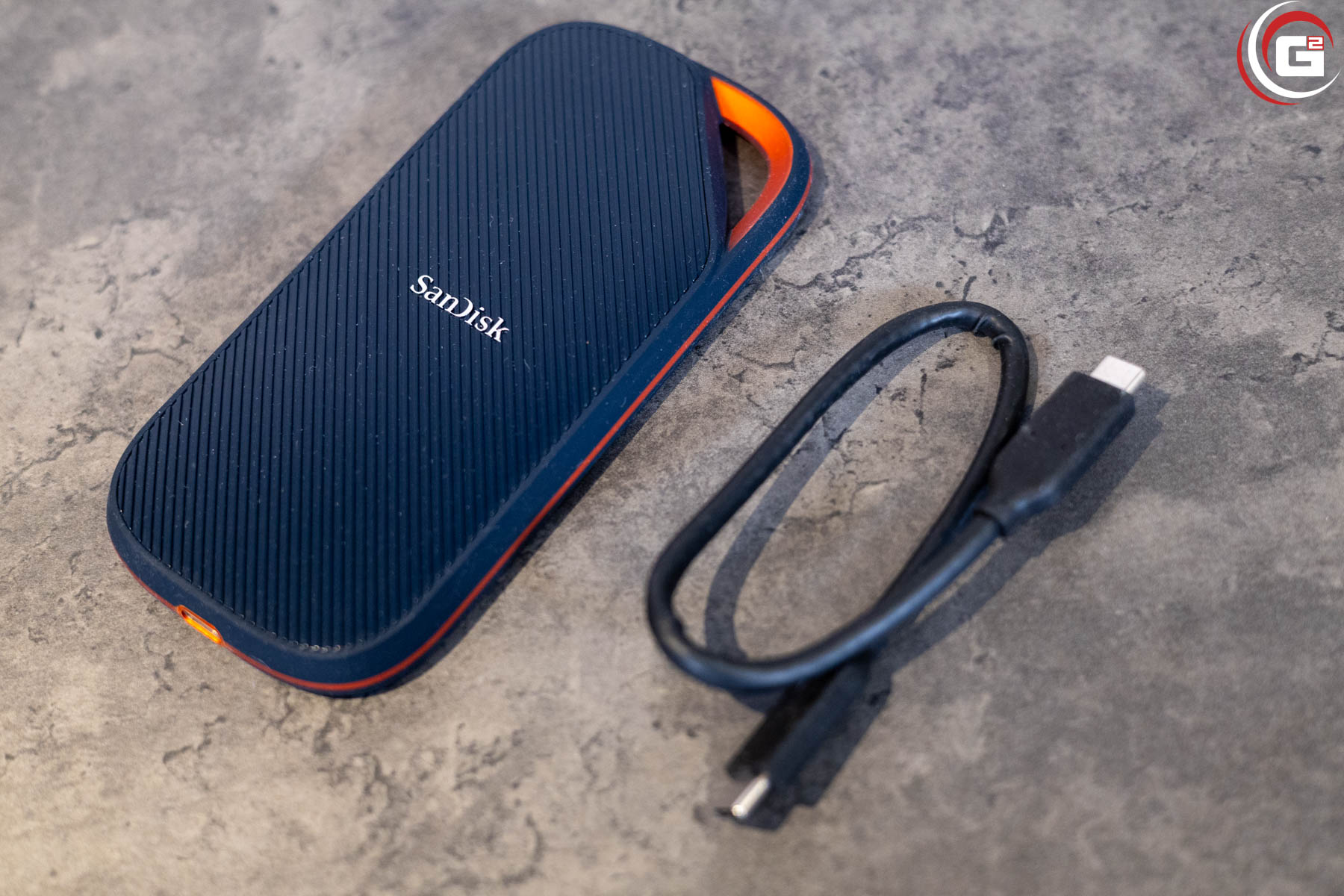 Die SanDisk Extreme Pro USB4 2 TB ist makellos und hochwertig verarbeitet. Das Gehäuse besteht aus einem orange eloxierten Aluminiumgehäuse mit einer Unter- und Oberseite aus dunkelblauem Silikon. Auf der oberen Fläche ist mittig in Weiß das SanDisk-Logo zu finden. Die Form entspricht der der SanDisk Extreme Portable, jedoch ist sie etwas größer. Durch ihre Rahmenform besitzt sie an der Ecke oben rechts eine Öse an der man beispielsweise ein Band oder ähnliches befestigen kann. Das USB-Kabel wird an der schmalen unteren Seite angeschlossen.