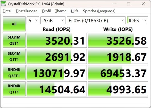 Ein für den Alltag im direkten Zugriff durchaus wichtiger Wert ist das Lesen und Schreiben von zufällig ausgewählten 4K-Blöcken. Denn dies entspricht eher einem Zugriff im normalen Einsatz des PCs oder beim Gaming. Für eine externe SSD sind die Werte dann relevant, wenn man von dieser direkt Spiele oder Programme ausführen möchte. Hier erreichen wir die folgenden Werte: