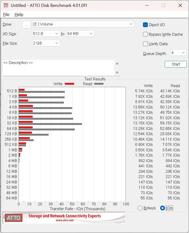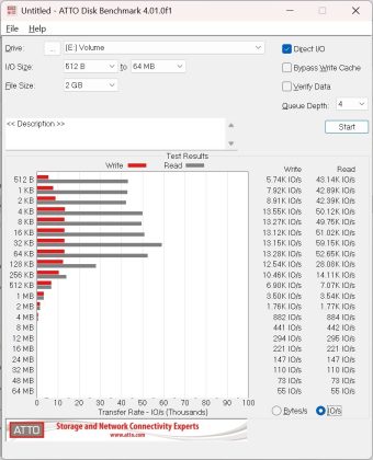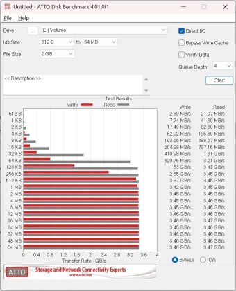 Ein spezielles Benchmark-Tool für SSDs. Dieses erfasst neben den Datenraten auch die Zugriffszeit auf die gesamte SSD. - Atto Disk Benchmark: