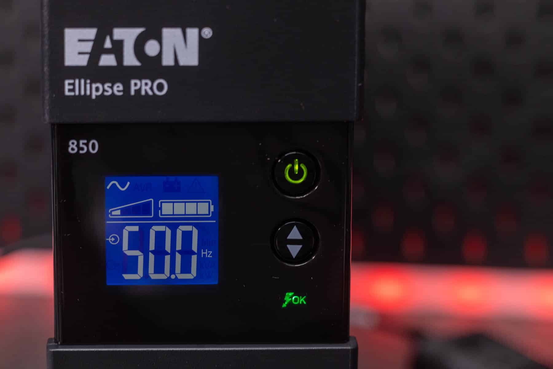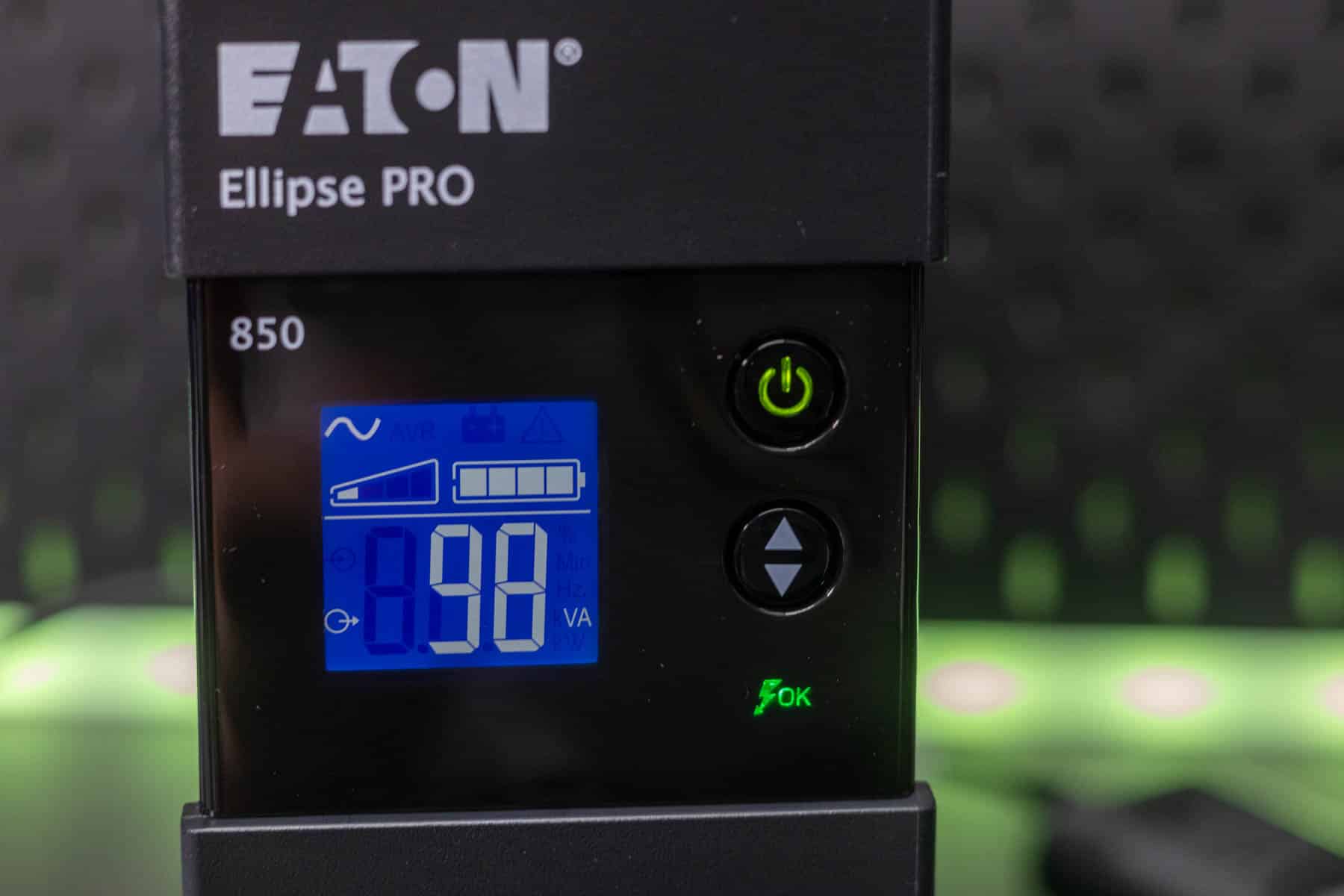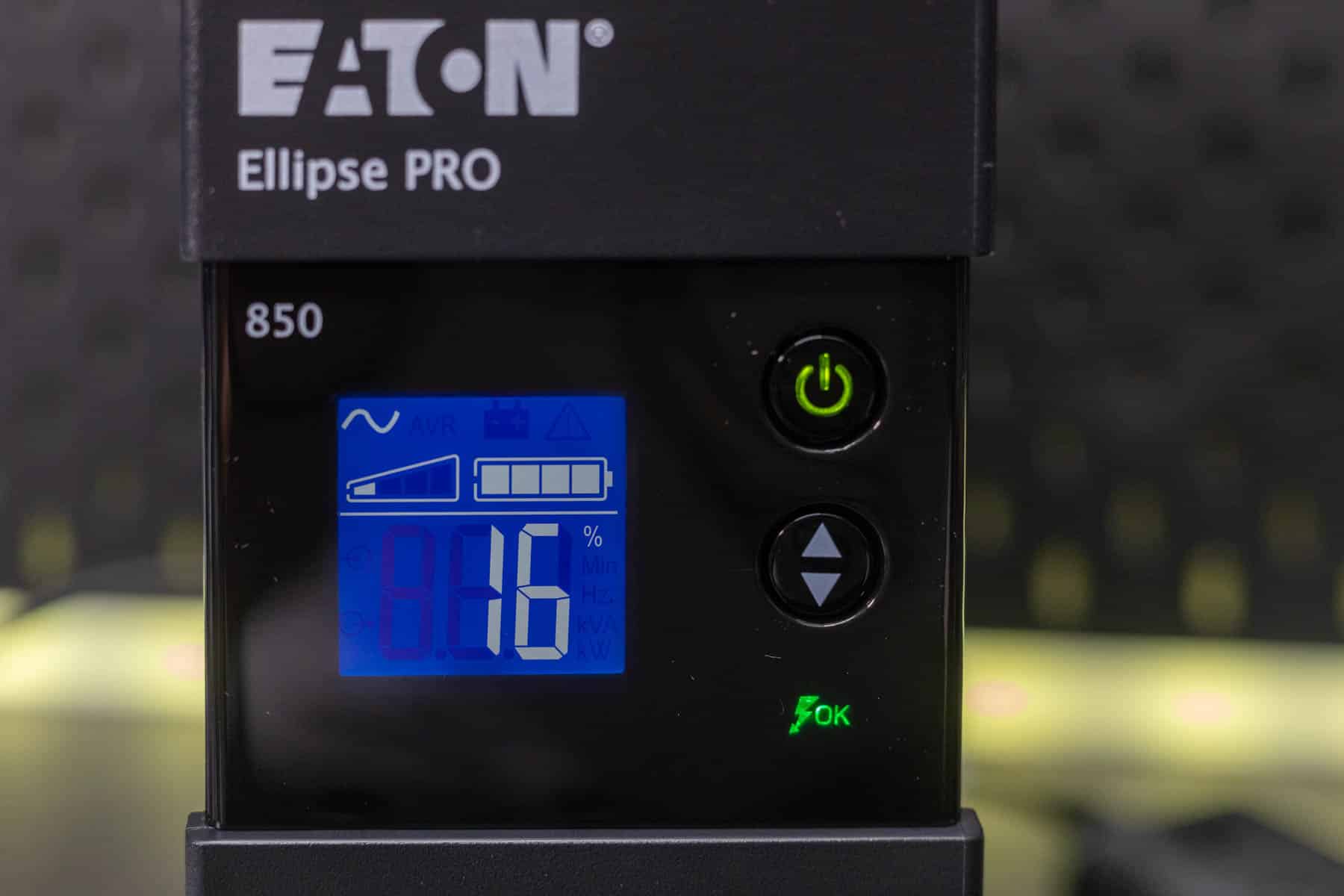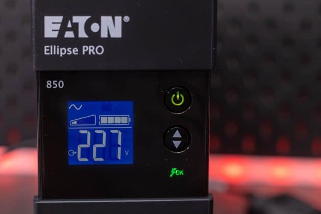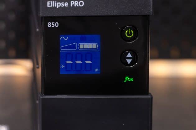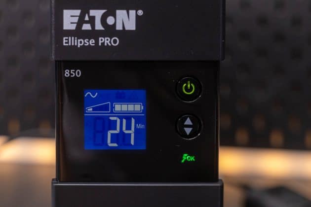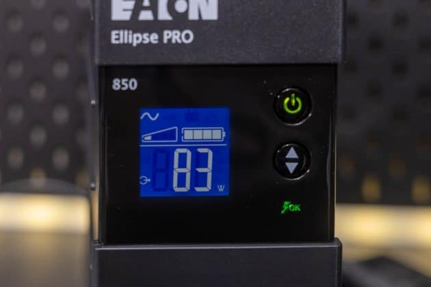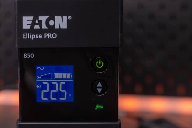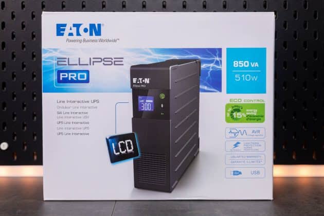 Die Eaton Ellipse PRO 850 ist eine Line Interactive USV-Anlage und bietet so neben einer Notstromversorgung auch einen Über- und Unterspannungsschutz. Sie verfügt über eine Nennleistung von 850 VA bzw. 510 W. Bei einer Auslastung von 50 % kann sie eine Notstromversorgung für 9 Minuten bereitstellen. Ein LCD-Display zeigt die aktuelle Leistung, die Spannung, den Ladezustand und weitere Informationen an. Zu einem Gerät, dass mit Backup und Überspannungsschutz angeschlossen wird, gibt es noch vier Steckdosen, die lediglich einen Überspannungsschutz bieten. Die Kommunikation mit einem angeschlossenen PC erfolgt via USB und Eaton USV-Companion. So wird ein sicheres Herunterfahren des angeschlossenen Systems im Falle eines Stromausfalls möglich. Die beiden RJ45-Anschlüsse ermöglichen das Durchschleifen eines Netzwerkkabels, um so auch hier einen Überspannungsschutz zu realisieren.