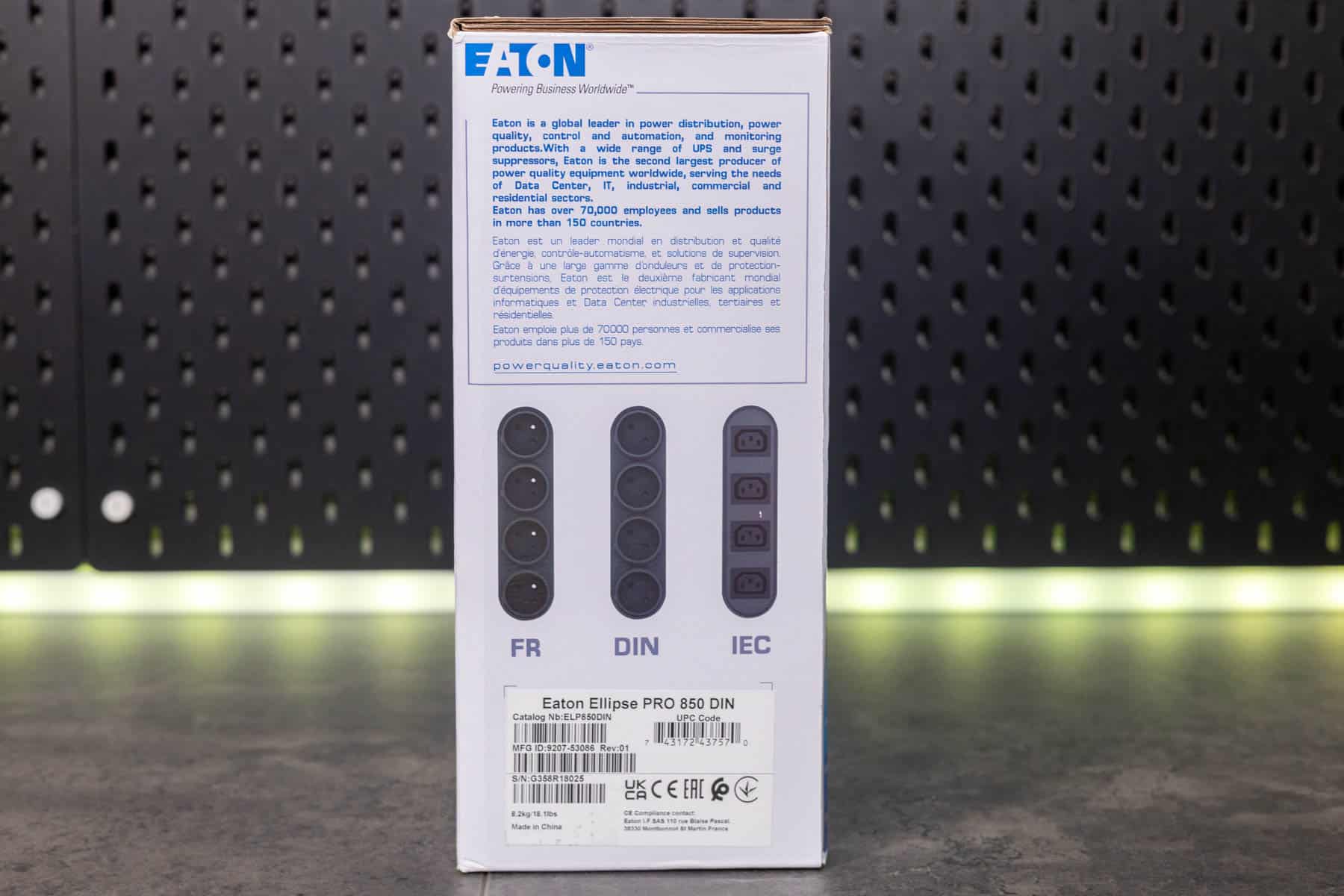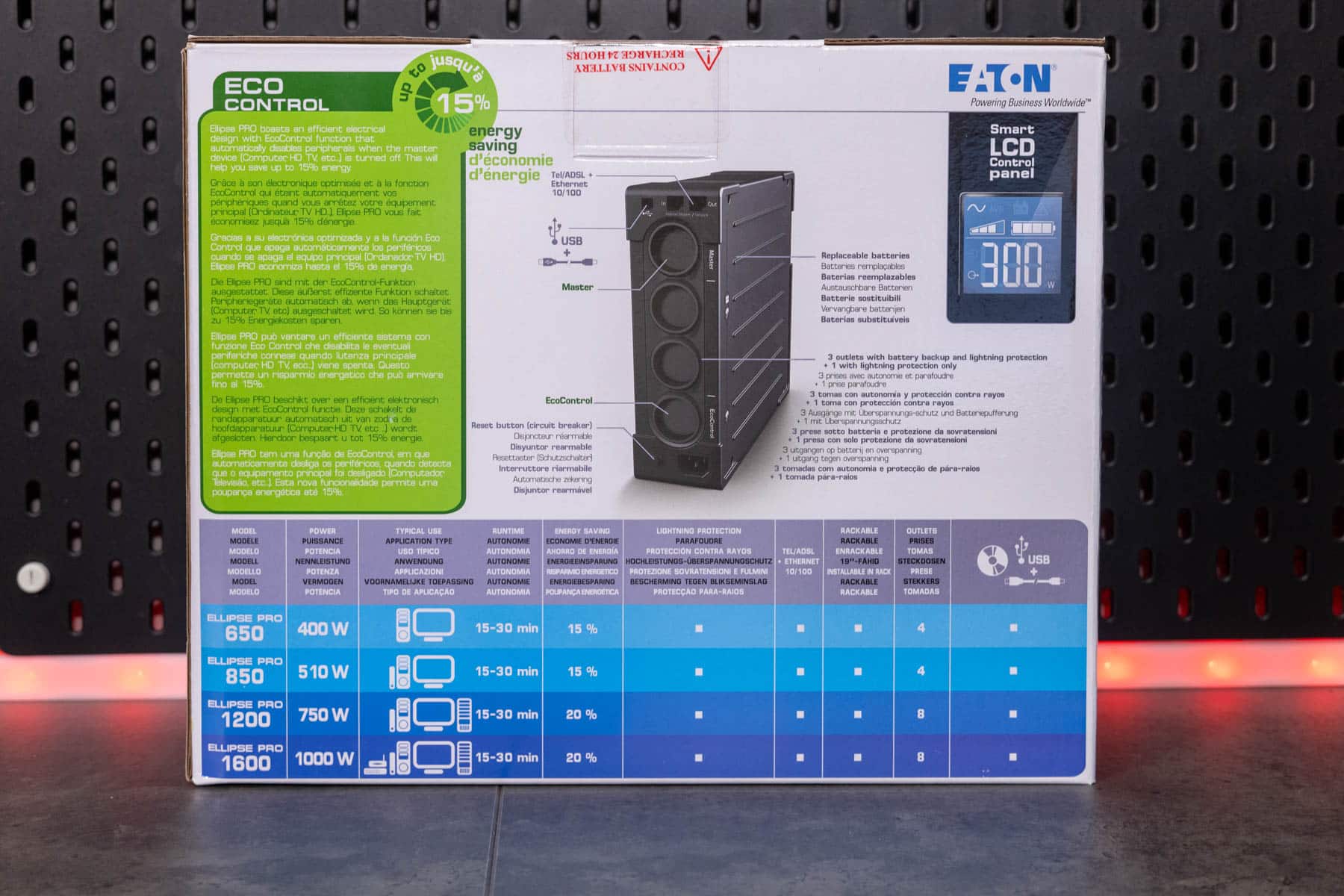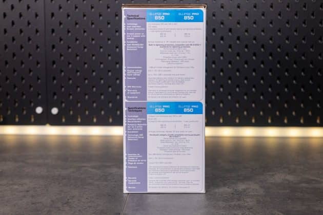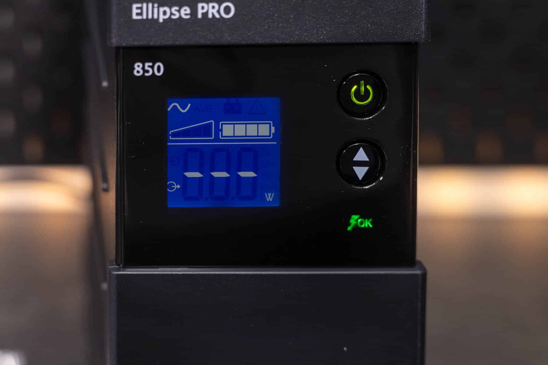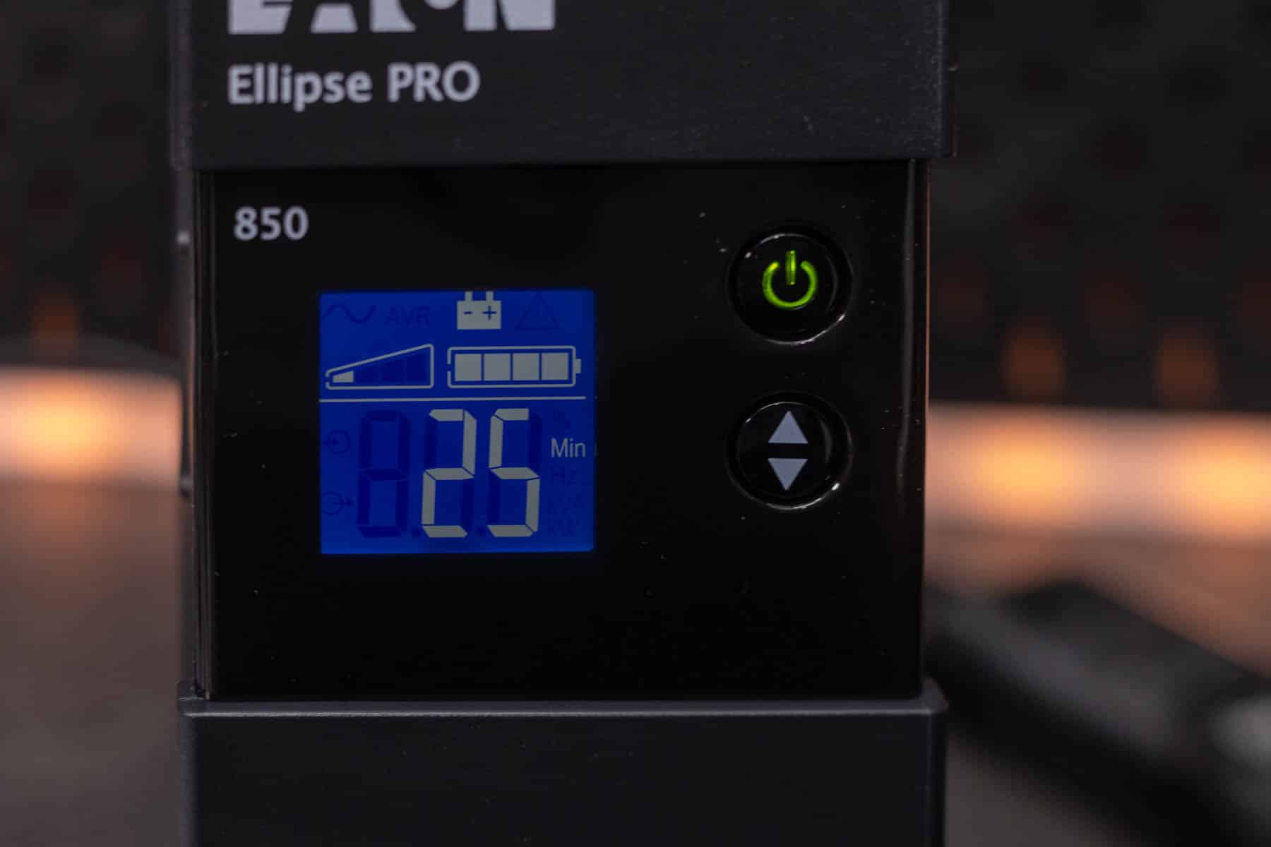Die Eaton Ellipse PRO 850 ist eine Line Interactive USV-Anlage und bietet so neben einer Notstromversorgung auch einen Über- und Unterspannungsschutz. Sie verfügt über eine Nennleistung von 850 VA bzw. 510 W. Bei einer Auslastung von 50 % kann sie eine Notstromversorgung für 9 Minuten bereitstellen. Ein LCD-Display zeigt die aktuelle Leistung, die Spannung, den Ladezustand und weitere Informationen an. Zu einem Gerät, dass mit Backup und Überspannungsschutz angeschlossen wird, gibt es noch vier Steckdosen, die lediglich einen Überspannungsschutz bieten. Die Kommunikation mit einem angeschlossenen PC erfolgt via USB und Eaton USV-Companion. So wird ein sicheres Herunterfahren des angeschlossenen Systems im Falle eines Stromausfalls möglich. Die beiden RJ45-Anschlüsse ermöglichen das Durchschleifen eines Netzwerkkabels, um so auch hier einen Überspannungsschutz zu realisieren.