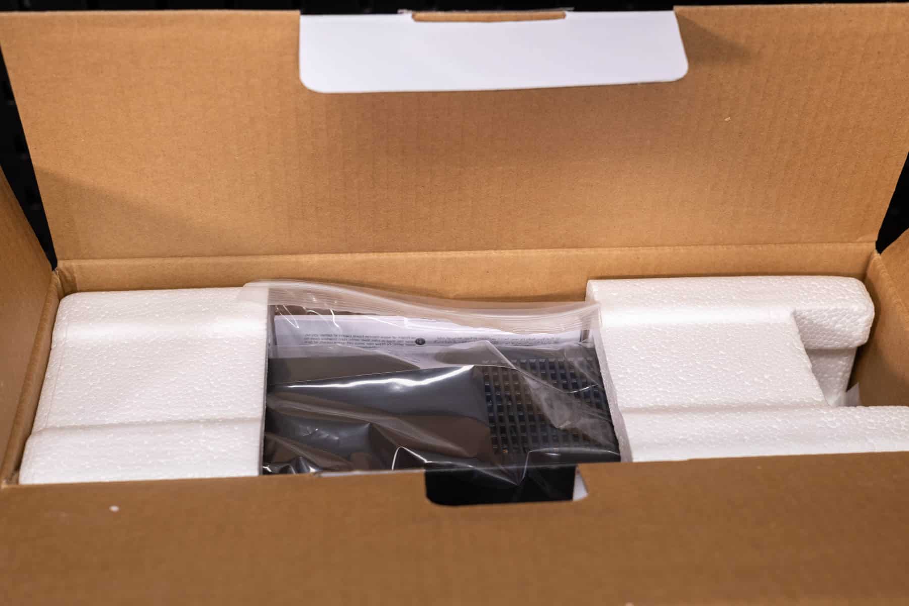 Geliefert wird die Eaton Ellipse PRO 850 im unternehmenstypischen Farbschema mit weißem Hintergrund. Auf der Vorderseite finden sich eine Produktabbildung sowie einige technische Highlights. Auf den weiteren Seiten werden weitere technische Details aufgelistet. Im Inneren wird die USV durch einen Folienbeutel und Styroporelemente geschützt. Der Lieferumfang besteht neben der USV noch aus einem USB-Kabel und einem RJ45-Kabel.