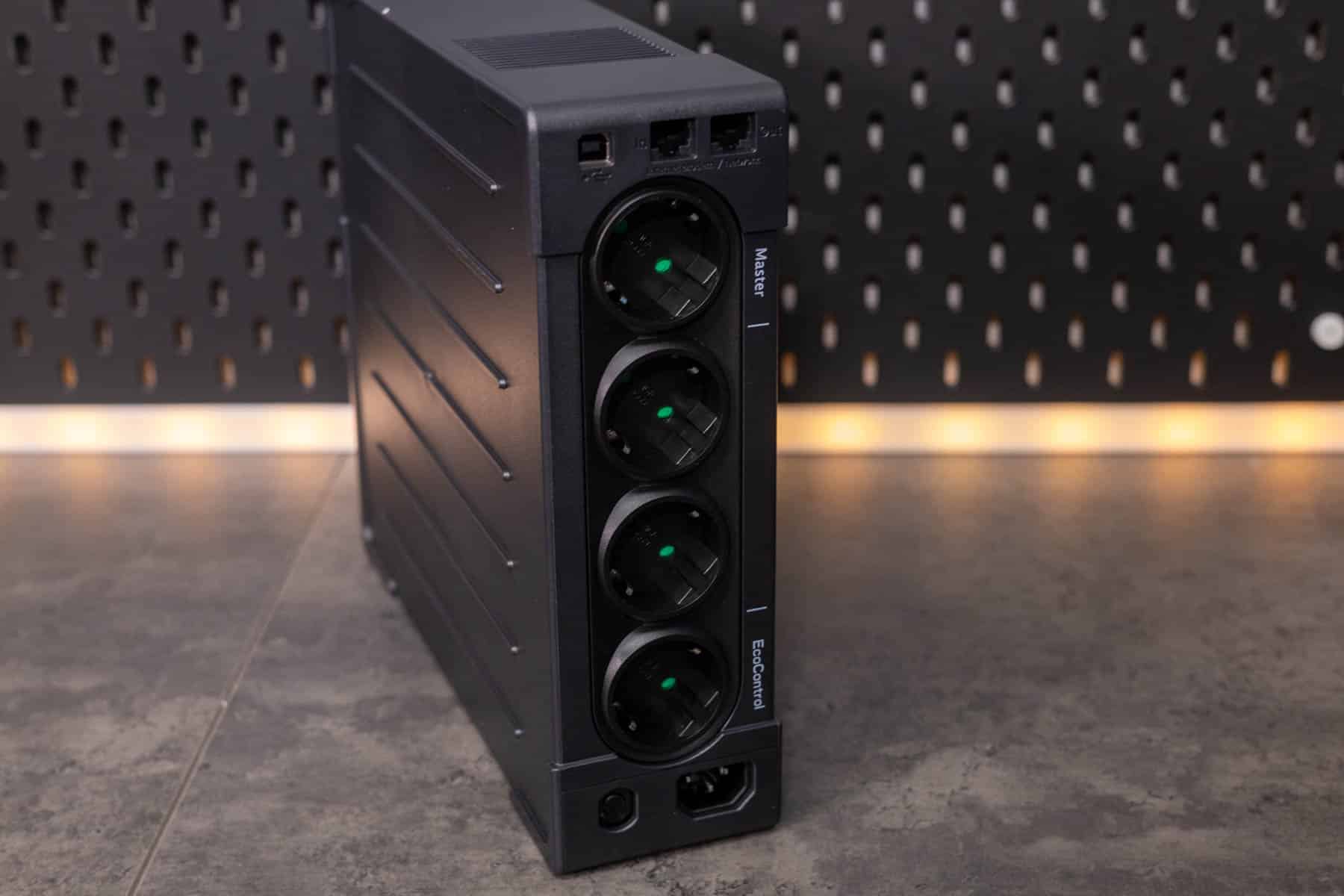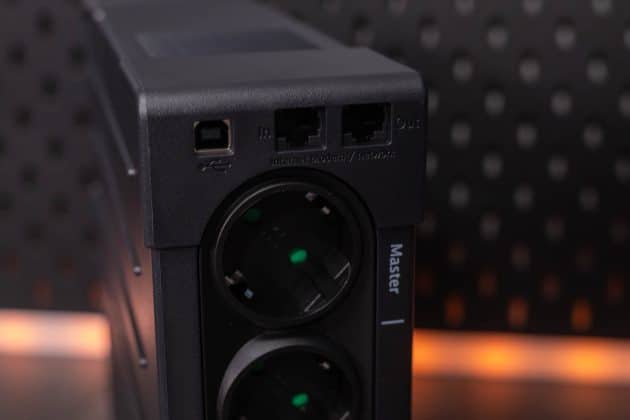 Der Anschluss der Eaton Ellipse PRO 850 ist denkbar einfach. Sie wird mittels Kaltgerätekabel mit der Steckdose verbunden und kann dann gewissermaßen wie eine Mehrfachsteckdose genutzt werden. Wie oben beschrieben, besitzen alle Anschlüsse einen Überspannungsschutz. Der obere Master-Anschluss bietet zusätzlich noch die USV-Funktionalitäten. Hier kann man dann das zu puffernde Elektrogerät anschließen. Vorteil des Master-Slave-Systems ist, dass die drei unteren Steckdosen erst dann eingeschaltet werden, wenn der Verbrauch am Master-Anschluss eingeschaltet ist. Da hier nur ein Anschluss mit USV-Funktionalität zur Verfügung steht, liegt der Fokus der USV darauf, ein System geordnet herunterfahren zu können und nicht noch ein paar Minuten mit der Akkuversorgung weiterzuarbeiten.