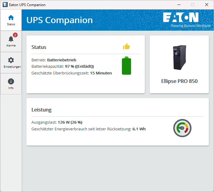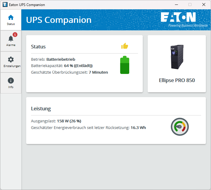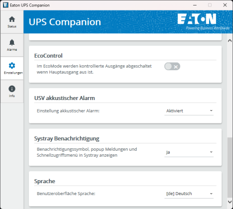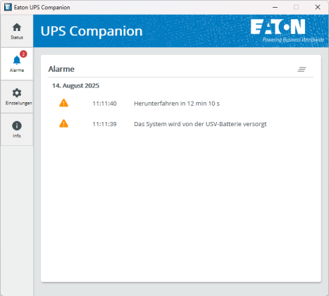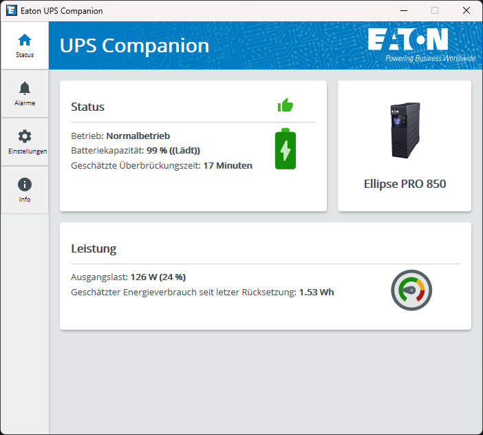 Damit der Computer auch ein Shutdown-Signal erhalten kann, muss man diesen mittels USB-Kabel mit der USV verbinden. Mit der Software Eaton UPS Companion ist eine einfache Verwaltung möglich.