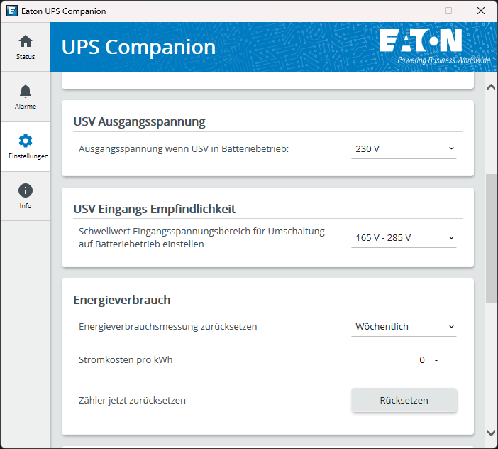 | Software | Eaton USV-Companion (sicheres Herunterfahren, Aufzeichnung des Energieverbrauchs und Konfiguration der USV) |
