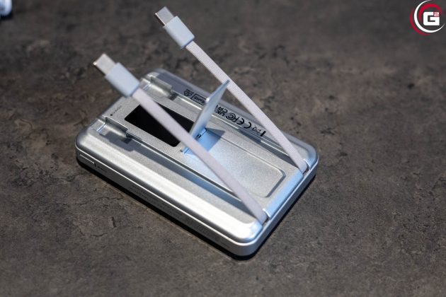 In das Gehäuse sind zwei USB-C®-Kabel integriert, die fest verbaut und seitlich eingefasst sind. Dadurch werden für den mobilen Einsatz keine losen Kabel benötigt. Zusätzlich verfügt die Powerbank über einen integrierten Standmechanismus auf der Rückseite, der das Aufstellen eines Smartphones im Hoch- oder Querformat während des Ladevorgangs ermöglicht.