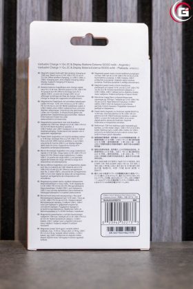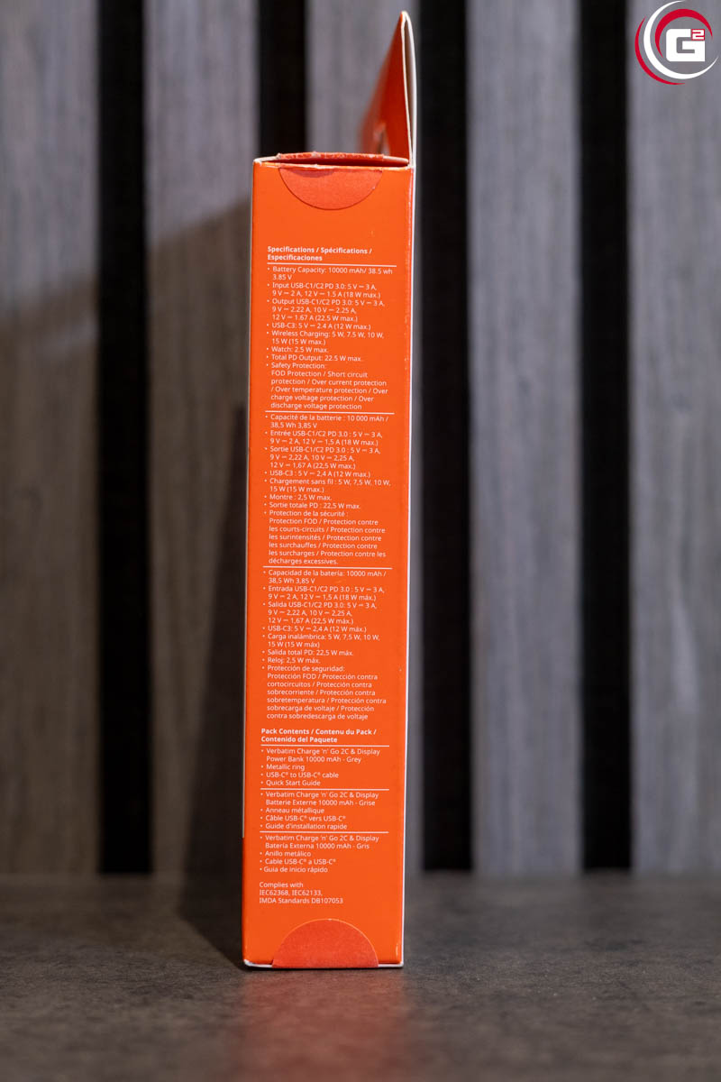 Die Umverpackung der Verbatim Charge’n’Go 2C & Display Power Bank folgt dem typischen, modernen Design von Verbatim, welches einen konsequenten Markenauftritt sicherstellt. Es kommt überwiegend ein weißer Hintergrund zum Einsatz, nur oben und unten sind die schmalen Seiten in Orange gehalten. Auf der Vorderseite findet sich eine Produktabbildung mit einigen technischen Highlights, weitere Details werden auf der Rückseite aufgelistet.