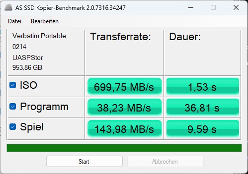 Die hier gemessenen Werte weichen insbesondere beim Schreiben von internen SSD deutlich ab. Allerdings ist eine externe SSD auch eher für die Arbeit mit großen Daten und das im Zusammenhang mit Datentransport/-sicherung besonders relevant.