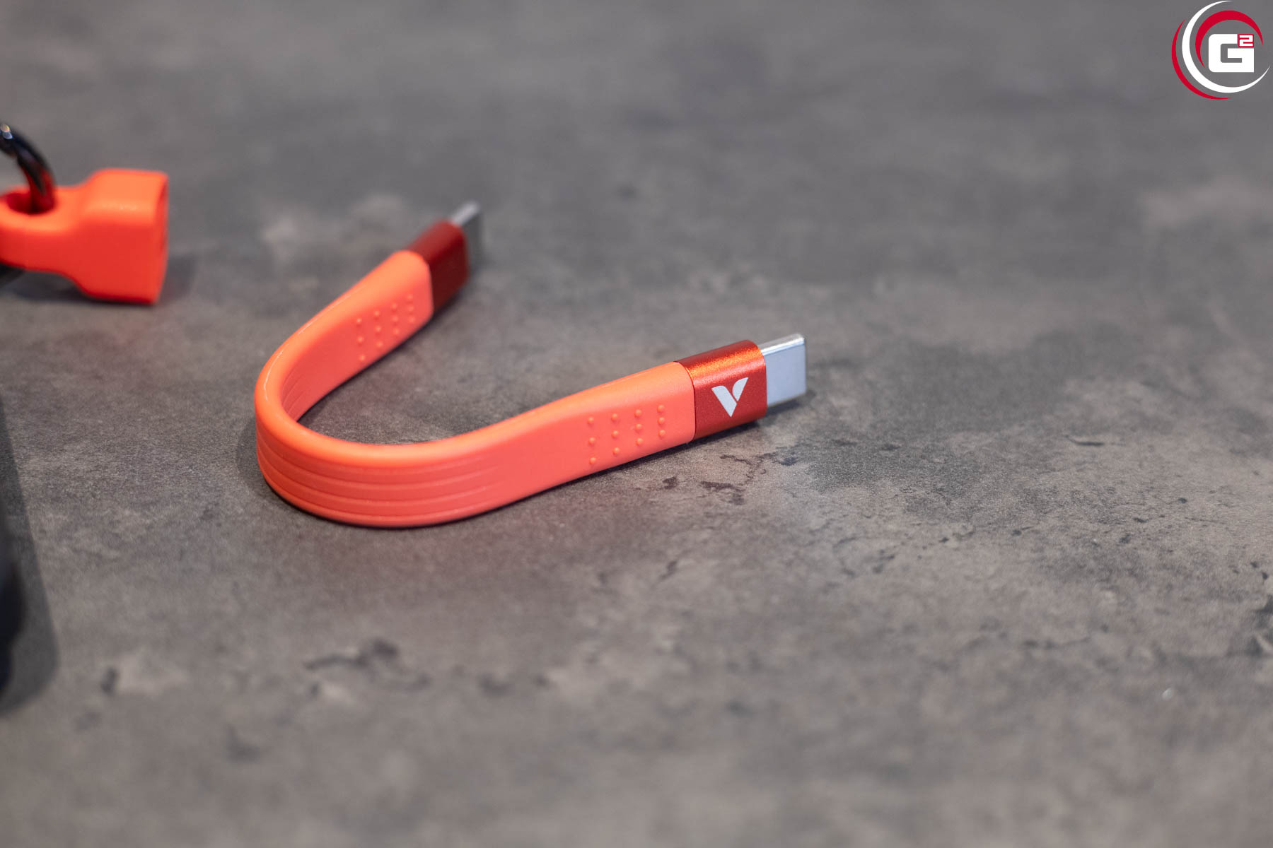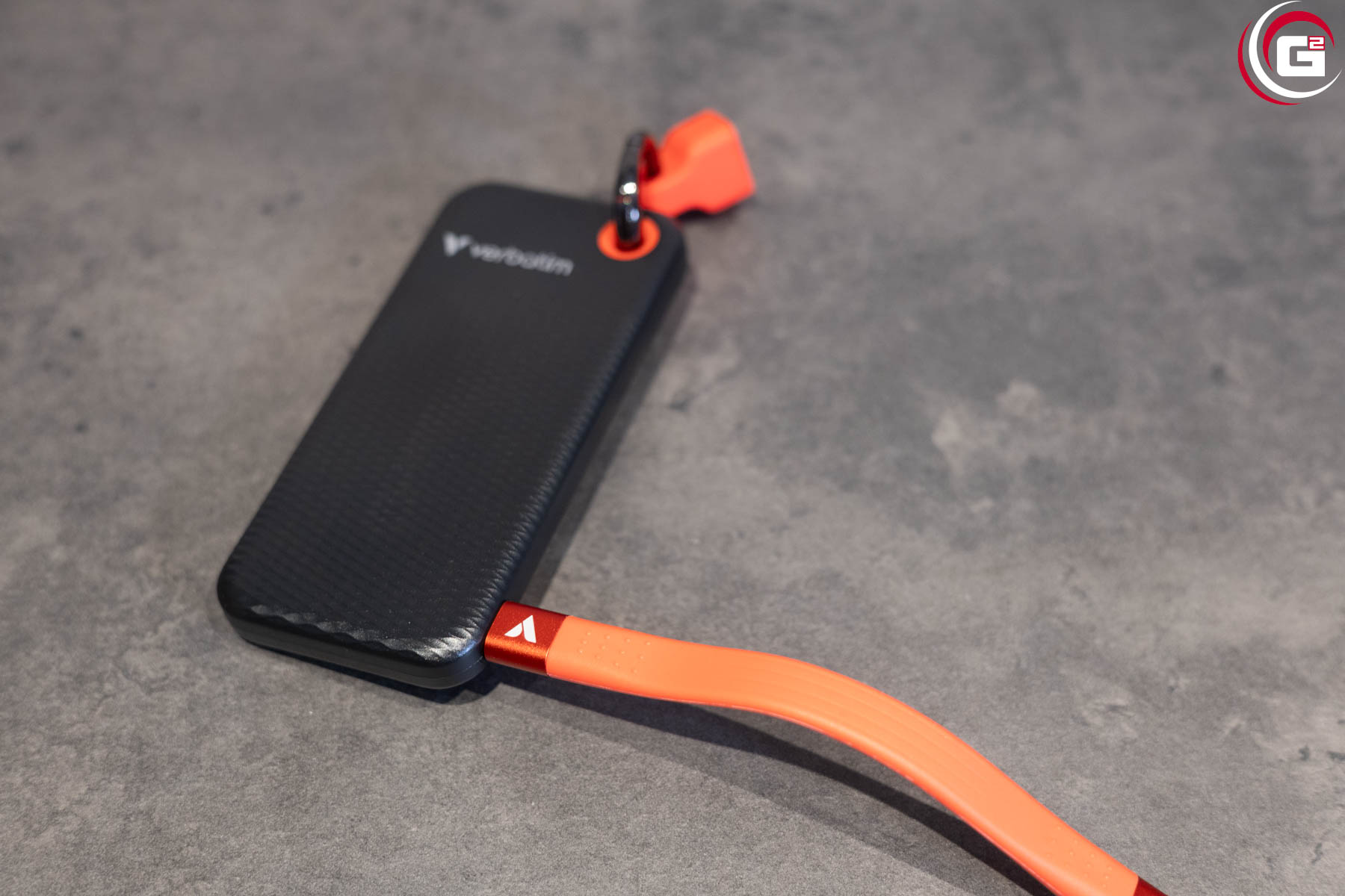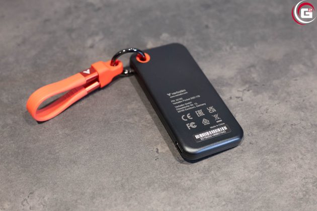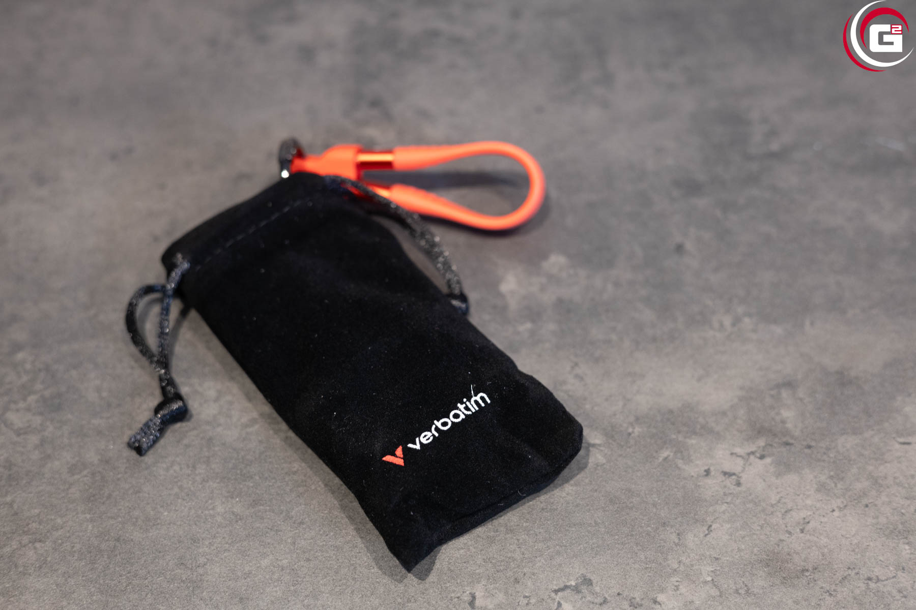 Die Verbatim Pocket SSD 1 TB ist makellos und hochwertig verarbeitet. Das Gehäuse besteht aus schwarzem Kunststoff mit einer teilweise geriffelten Oberfläche. Hier findet sich auch ein silbernes Verbatim-Logo. Oben rechts ist eine Öffnung mit orangem Inlay, durch die ein Schlüsselring gezogen ist. An diesem lässt sich das USB-C-Kabel befestigen. Das Kabel ist sehr kurz bemessen und steif, aber natürlich ideal für den schnellen Einsatz unterwegs. Für den geschützten Transport der SSD liegt ein passgenauer Beutel aus schwarzem Samtstoff bei.