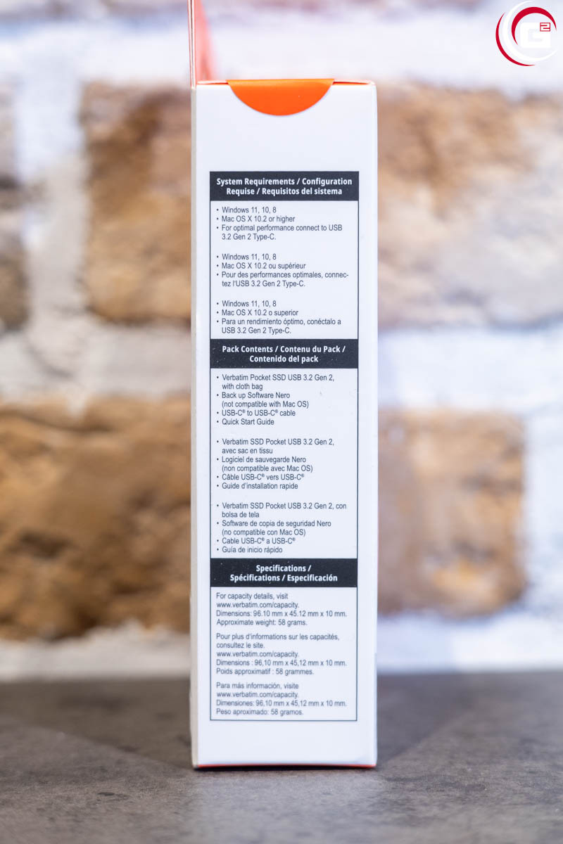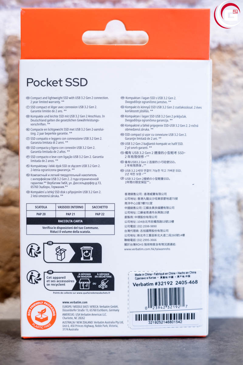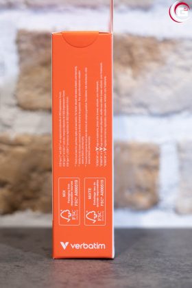 Die Umverpackung der Verbatim Pocket SSD 1 TB ist insgesamt recht dezent mit einem weißen Hintergrund und orangen Seiten gestaltet. Auf der Vorderseite findet sich eine Produktabbildung mit einigen technischen Highlights, weitere Details werden auf der Rückseite aufgelistet.