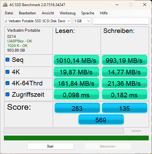 Die hier gemessenen Werte weichen insbesondere beim Schreiben von internen SSD deutlich ab. Allerdings ist eine externe SSD auch eher für die Arbeit mit großen Daten und das im Zusammenhang mit Datentransport/-sicherung besonders relevant.
