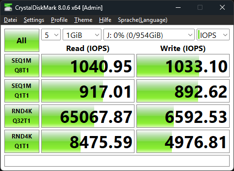 Ein für den Alltag durchaus wichtiger Wert ist das Lesen und Schreiben von zufällig ausgewählten 4K-Blöcken. Denn dies entspricht eher einem Zugriff im normalen Einsatz des PCs oder beim Gaming. Für eine externe SSD sind die Werte dann relevant, wenn man von dieser direkt Spiele oder Programme ausführen möchte. Hier erreichen wir die folgenden Werte: