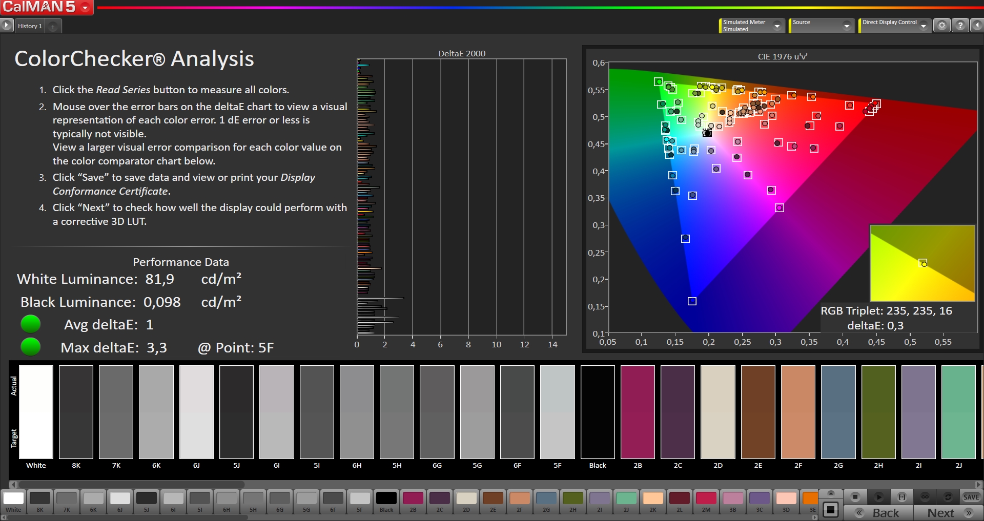 Die erste Messung zeigt, dass der durchschnittliche deltaE-Wert bei 1 liegt, während das Maximum bei 3,3 liegt. In weiteren Messungen konnten wir feststellen, dass Maximalwert weiter sinkt und sich etwa bei 2,8 einpendelt.