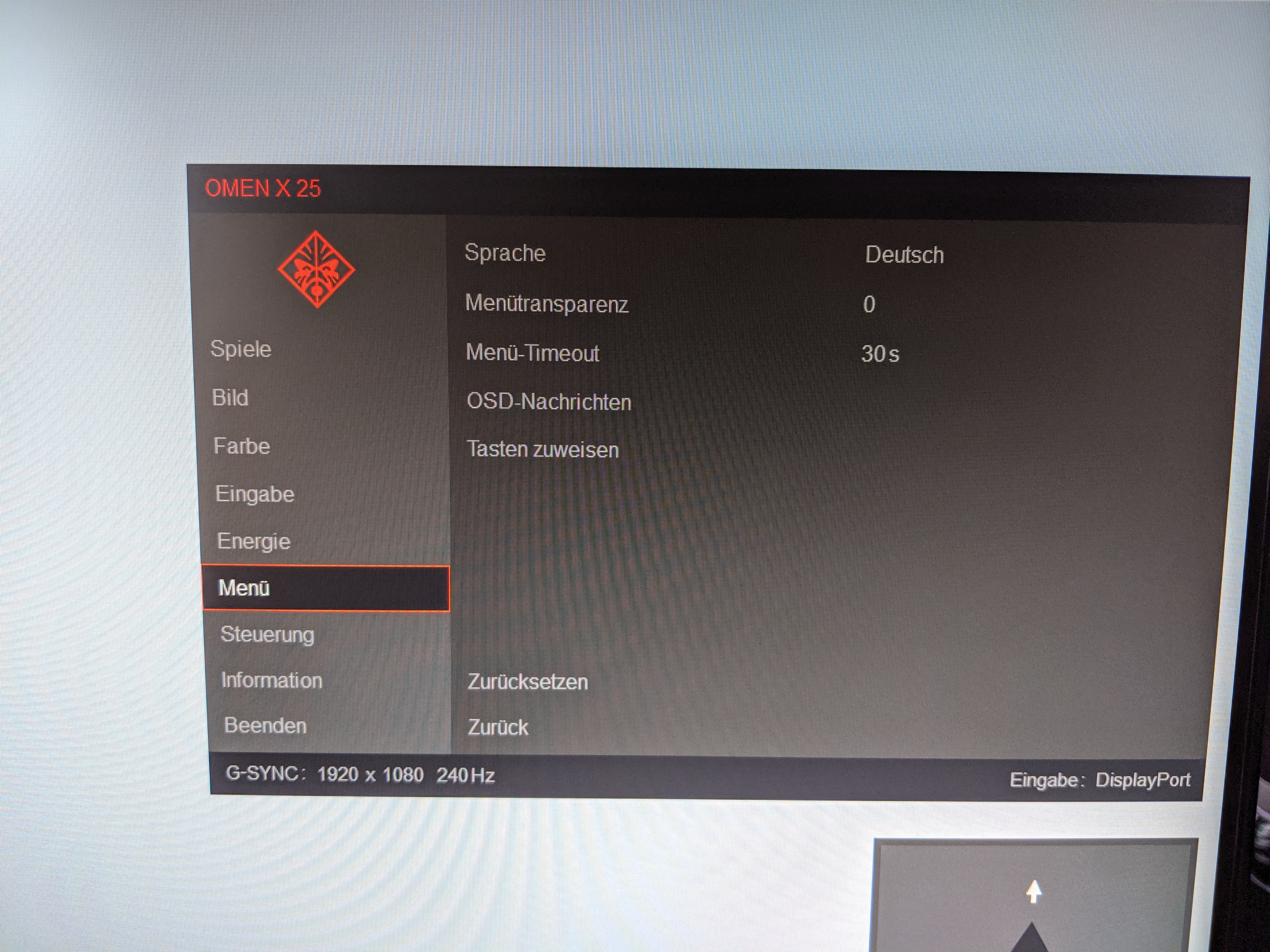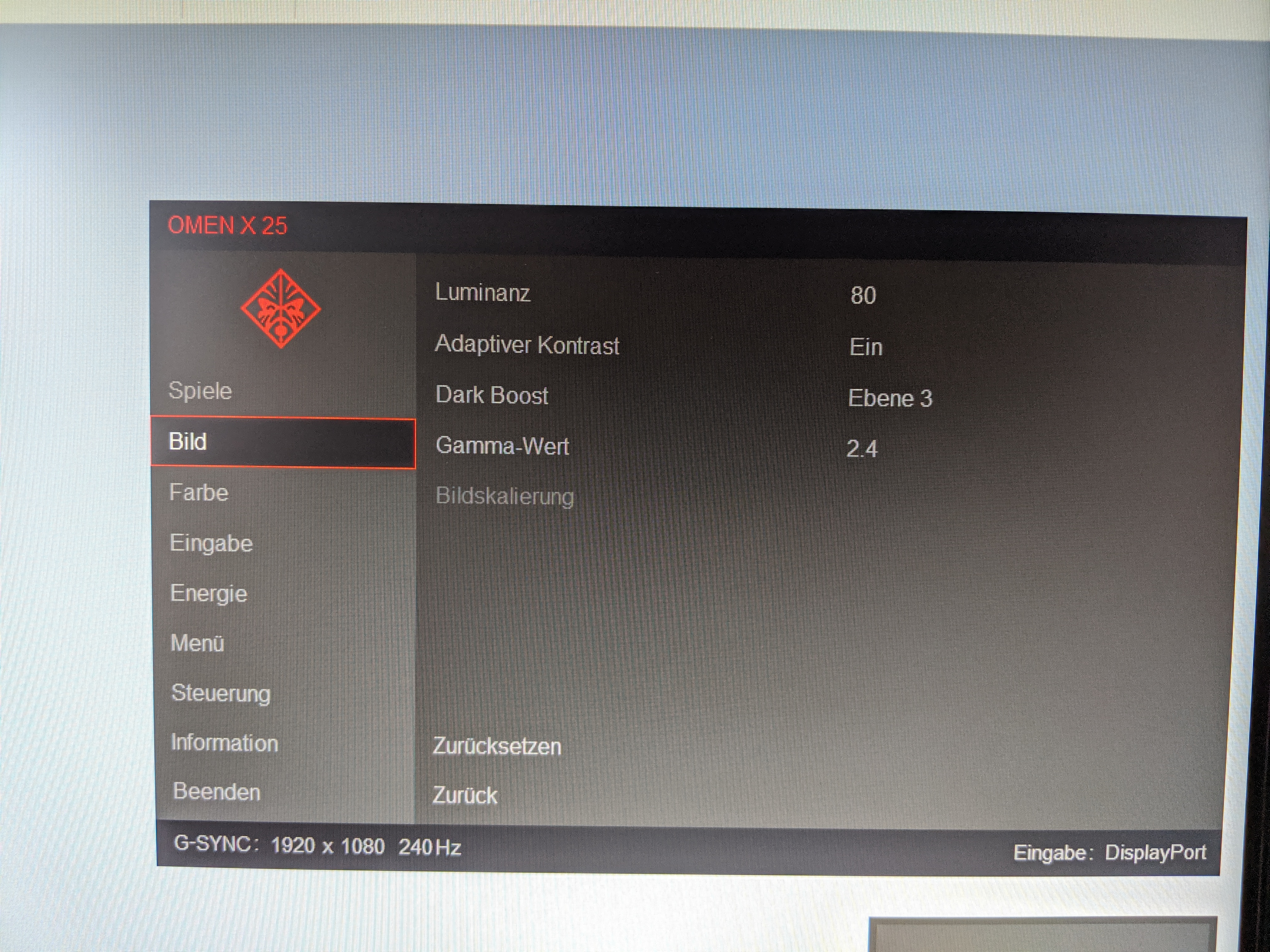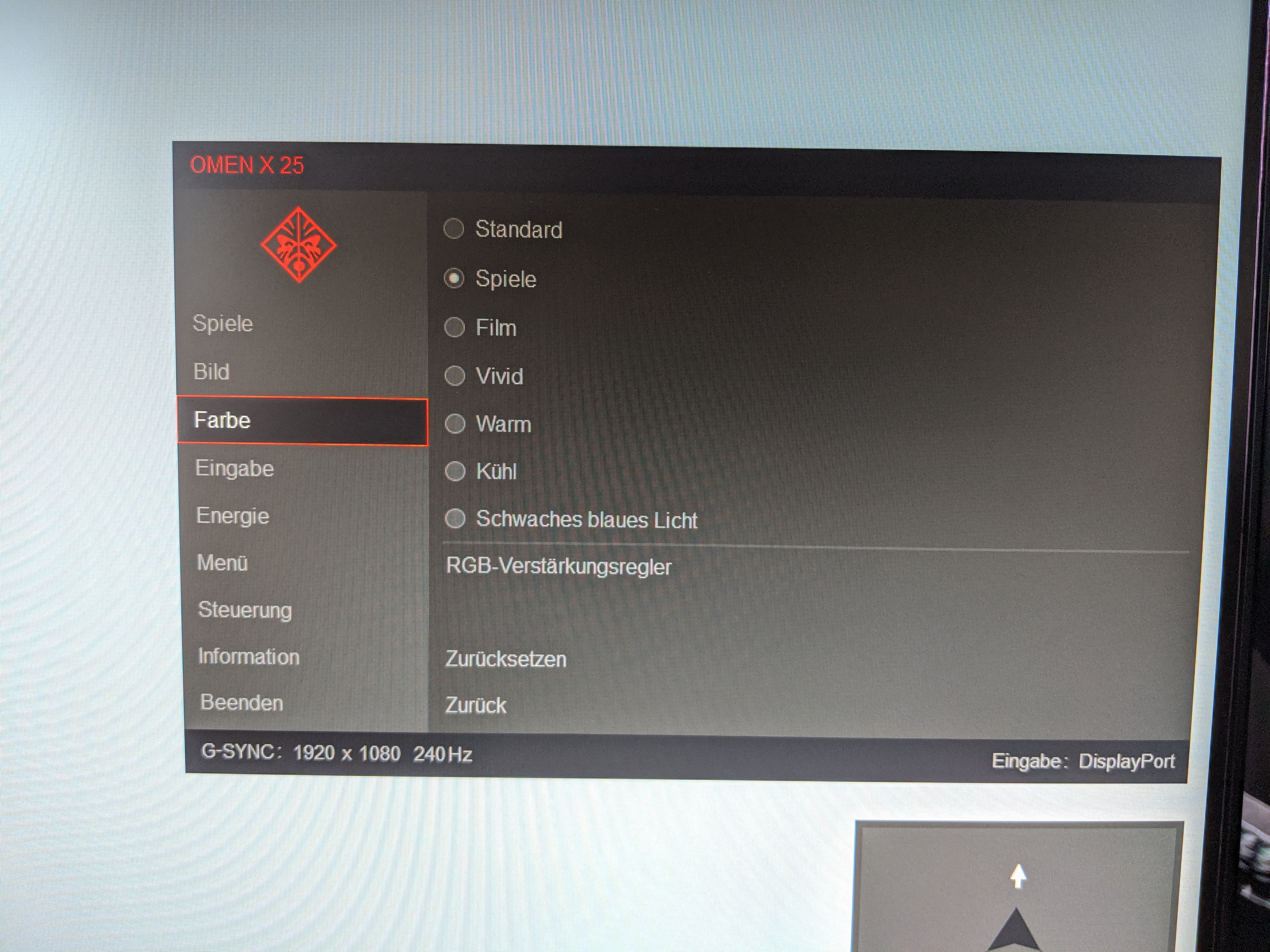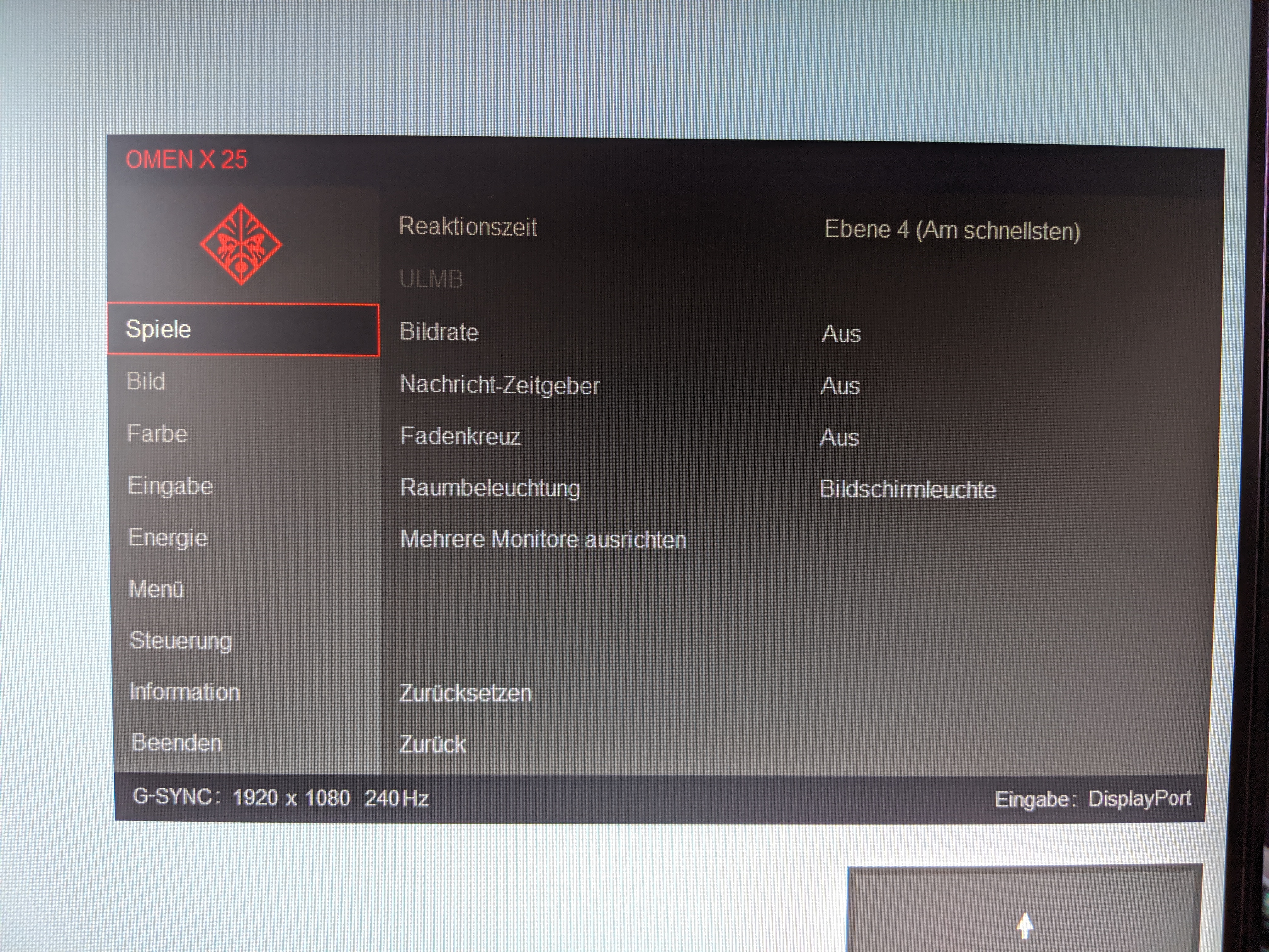 So bietet der Monitor die Möglichkeit speziell für Spiele bestimmte Features, wie beispielsweise die Bildrate, dauerhaft anzeigen zu lassen. Es ist aber auch möglich ein Fadenkreuz dauerhaft in der Bildschirmmitte anzuzeigen, was bei manchem Shooter einen (eher unfairen) Vorteil bringen kann. Zusätzlich kann in diesem Menü unter dem Punkt „Raumbeleuchtung“ die Art der LED-Beleuchtung bestimmt werden. Das geht von der Wahl einzelner Farben über wechselnde Spektren, bis hin zur dynamischen Beleuchtung im Zusammenhang mit Bildschirminhalten.