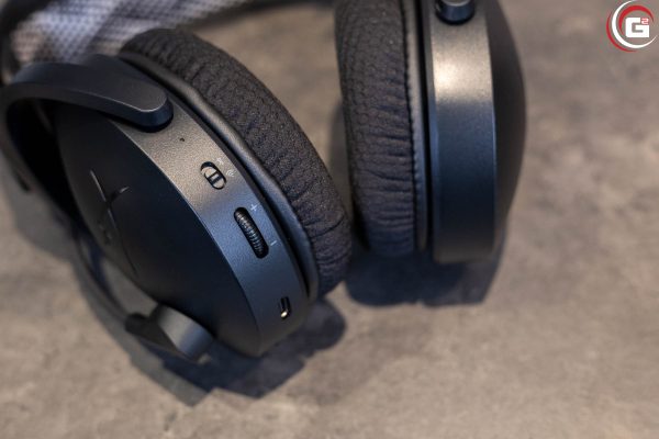 An der linken Ohrmuschel befinden sich alle Bedienelemente. Hier gibt es ein Rad zur Lautstärkeregelung, einen Umschalter für 2,4-GHz- oder Bluetooth-Verbindung, den Ein-/Ausschalter und den USB-C-Ladeanschluss.