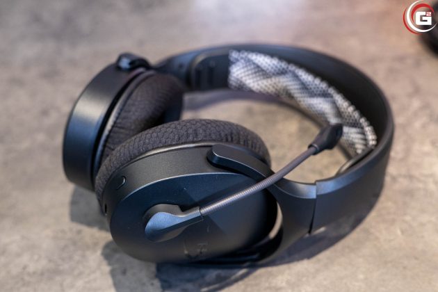 Das Mikrofon ist schwenkbar an der rechten Ohrmuschel montiert. Sobald man es herunterklappt, wird es eingeschalten, beim Hochklappen entsprechend stumm geschaltet. Zudem ist der Arm des Mikrofons flexibel aufgebaut, sodass man es gut vor dem Mund platzieren kann.