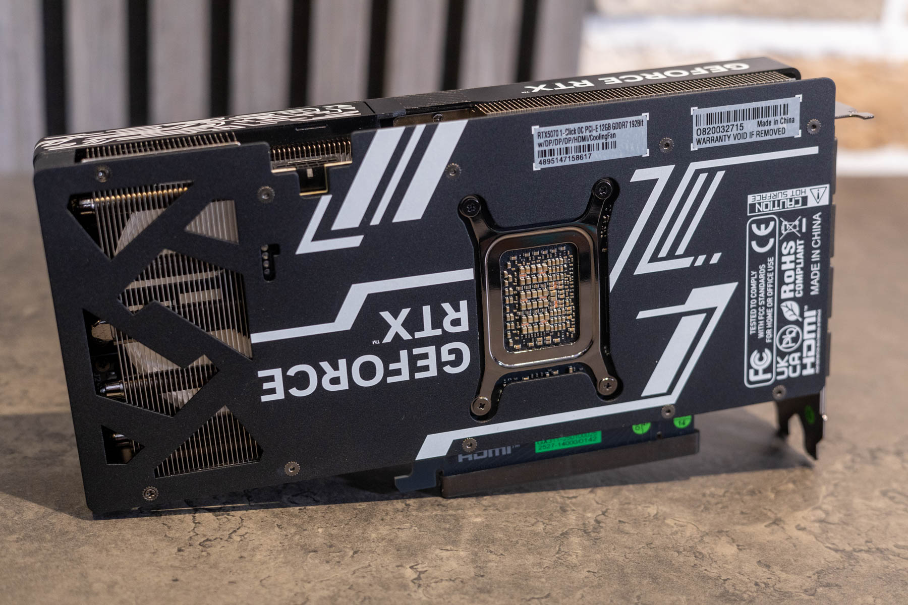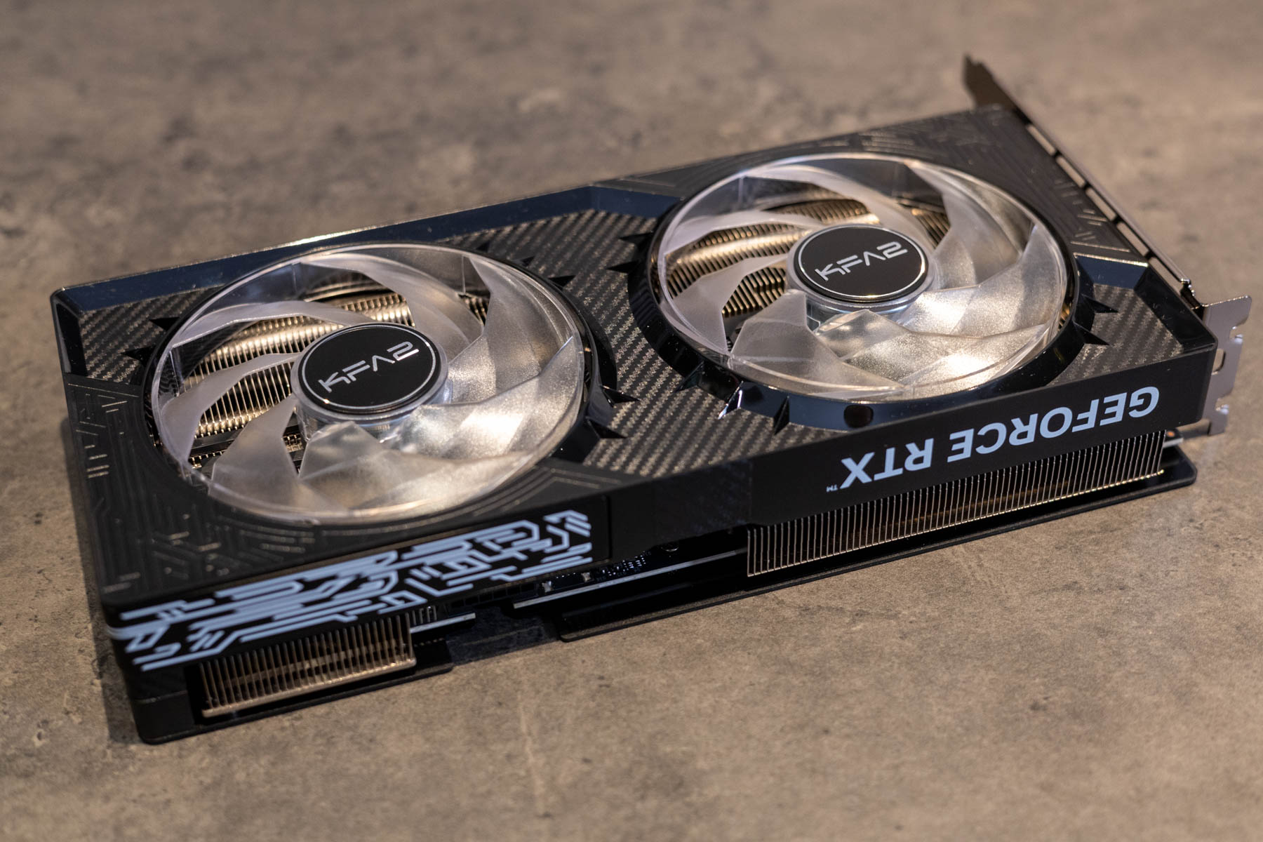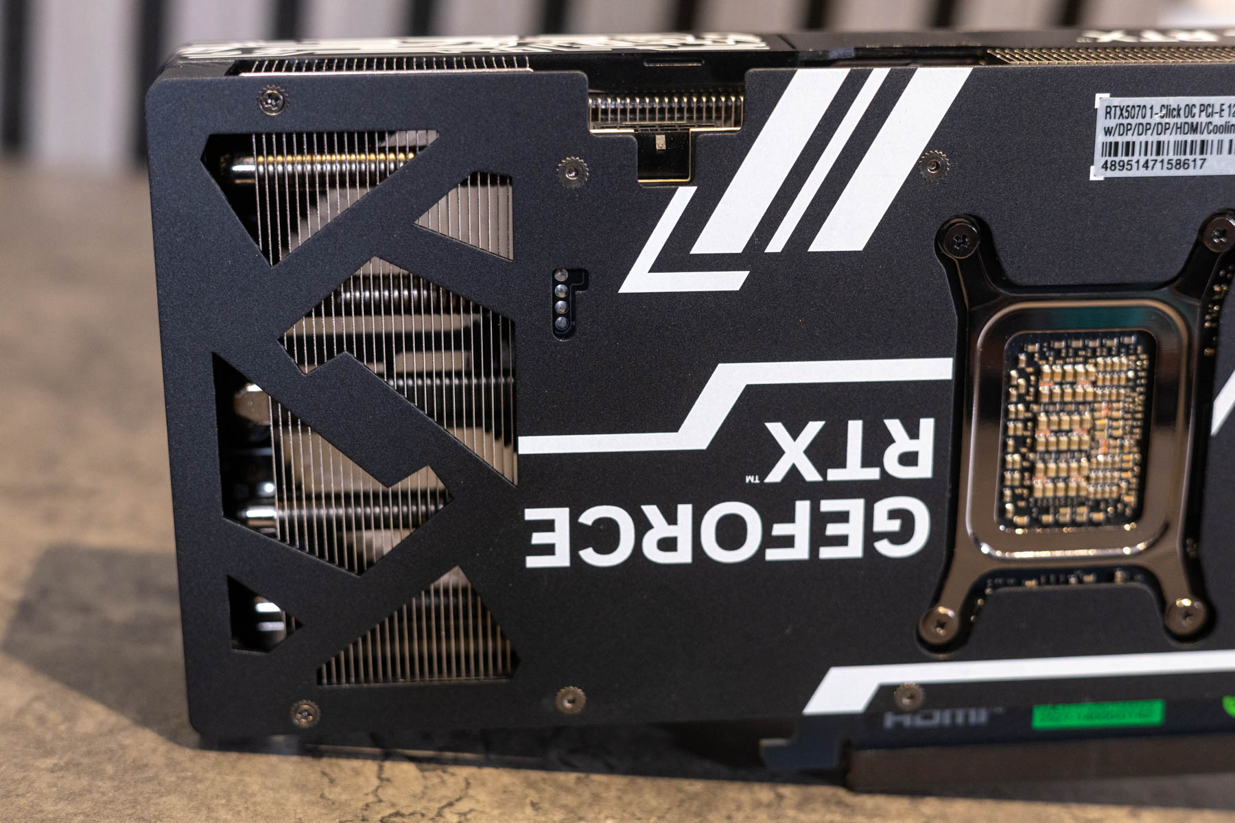 Insbesondere im Vergleich zu vielen anderen aktuellen Grafikkarten fällt direkt das besonders kompakte Design der KFA2 GeForce RTX 5070 1-Click OC ins Auge. Das Äußere der Karte ist fast vollständig in Schwarz gehalten, im Kontrast dazu steht der seitliche GeForce-Schriftzug und der ebenfalls weiße GeForce-RTX-Print auf der Backplate. Besonders ins Auge stechen auch die Lüfter mit ihren transparenten Rotorblättern. Die Backplate ist durchbrochen ausgeführt, sodass ein Teil des Luftstroms durch den hinteren Teil des Kühlkörpers komplett hindurch geführt werden kann. Der Stromanschluss ist etwas nach innen versetzt positioniert, sodass der Stecker des Stromkabels nicht übersteht. Das PCB ist ebenfalls in Schwarz ausgeführt. Alle Komponenten sind sauber und gleichmäßig verarbeitet.