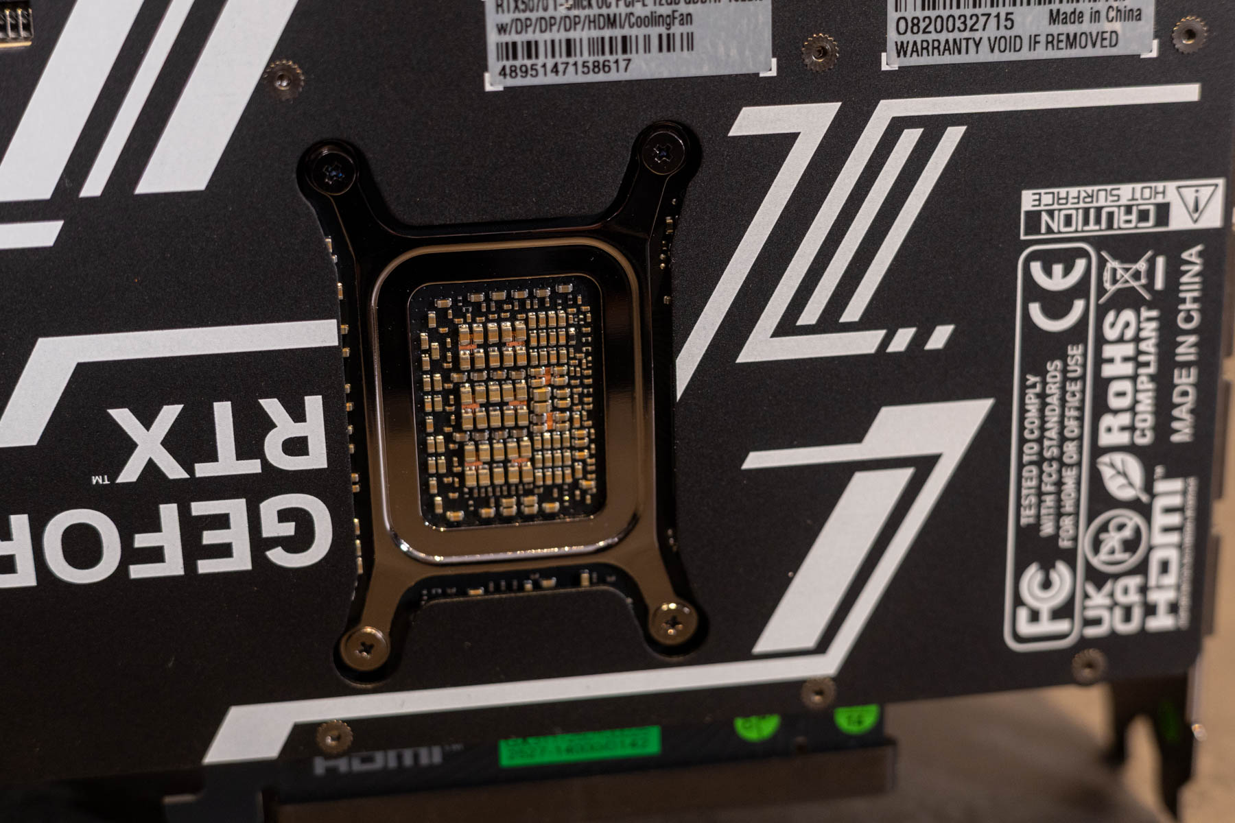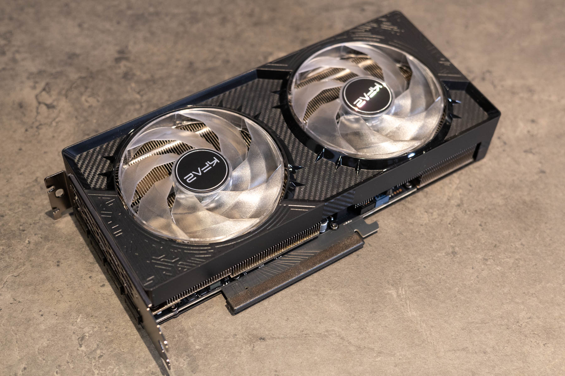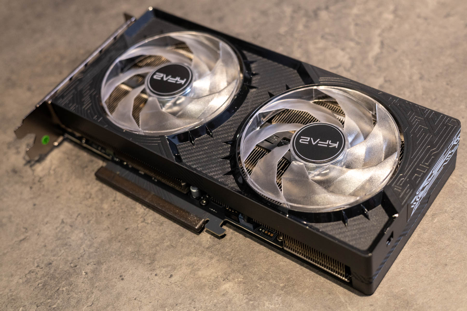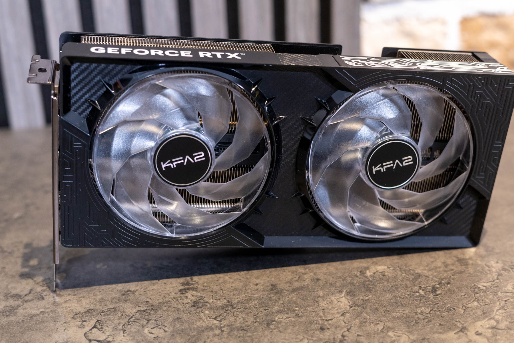 Insbesondere im Vergleich zu vielen anderen aktuellen Grafikkarten fällt direkt das besonders kompakte Design der KFA2 GeForce RTX 5070 1-Click OC ins Auge. Das Äußere der Karte ist fast vollständig in Schwarz gehalten, im Kontrast dazu steht der seitliche GeForce-Schriftzug und der ebenfalls weiße GeForce-RTX-Print auf der Backplate. Besonders ins Auge stechen auch die Lüfter mit ihren transparenten Rotorblättern. Die Backplate ist durchbrochen ausgeführt, sodass ein Teil des Luftstroms durch den hinteren Teil des Kühlkörpers komplett hindurch geführt werden kann. Der Stromanschluss ist etwas nach innen versetzt positioniert, sodass der Stecker des Stromkabels nicht übersteht. Das PCB ist ebenfalls in Schwarz ausgeführt. Alle Komponenten sind sauber und gleichmäßig verarbeitet.