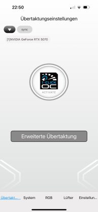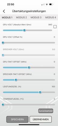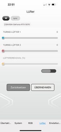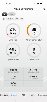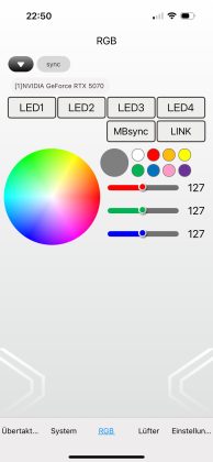 Die Smartphone-App ist übersichtlich aufgebaut. Man kann mehrere OC-Profile erstellen und einzeln aktivieren. Ebenso ist es möglich, die Lüfterdrehzahl manuell, für beide Lüfter getrennt, anzupassen. Bei der Einstellung der RGB-Effekte hat man die gleichen Optionen wie in der PC-Software. Hier kann man diverse vorkonfigurierte Profile anwählen und natürlich auch manuell statische Farben anpassen. Zum Übernehmen der Farbeinstellungen muss man dran denken, bis nach unten zu scrollen und die Einstellung zu bestätigen. Ein praktisches Feature ist auch das System-Info-Display. Hier kann man sich aktuelle Daten zu den Taktraten, den Lüftern und der Temperatur der Karte anzeigen lassen.