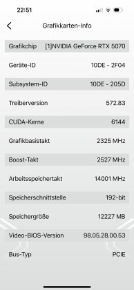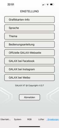 Für die Anpassung der Beleuchtung und auch für das Overclocking setzt die KFA2 GeForce RTX 5070 1-Click OC auf die Xtreme Tuner Plus App von KFA2. Die Software bietet zum einen das komfortable 1-Click OC, mit dem die Grafikkarte direkt in einen erprobten Übertaktungsmodus versetzt werden kann, zum anderen ist aber auch manuelles OC möglich. Auch eine Konfiguration der Lüfter ist hier möglich, sodass man optimierte Lüfterkurven hinterlegen kann. Bei der Konfiguration der Beleuchtung hat man eine große Auswahl an Presets zur Verfügung, kann aber auch manuelle Anpassungen vornehmen. Mit einer speziellen Version für mobile Endgeräte (Android und iOS) können alle Anpassungen auch abseits des PCs vorgenommen werden. Ein durchaus praktisches Feature, wenn man gerade nicht das Spiel minimieren kann. Zudem kann man die mobile App auch nutzen, um Systemparameter auf einem externen Display zu visualisieren.