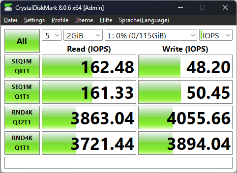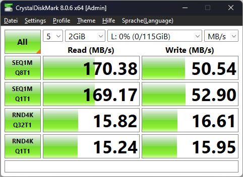 Auch wenn bei diesem USB-Stick der Fokus nicht auf der Geschwindigkeit, sondern auf der Sicherheit liegt, wollen wir dennoch einen kurzen Test der Übertragungsraten durchführen. Hier haben wir uns für CrystalDiskMark entschieden.