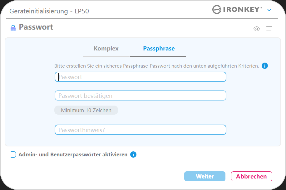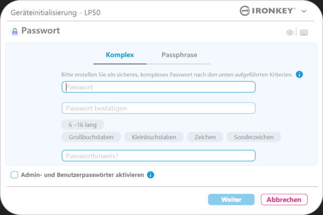 Verbindet man den Kingston Ironkey Locker+ 50 mit dem PC, erscheint zunächst ein DVD-RW-Laufwerk, über das man die Verschlüsselungssoftware aufrufen kann. Beim ersten Zugriff muss man hier zunächst ein Kennwort oder eine Passphrase, diese kann beispielsweise auch ein Satz sein, hinterlegen. Beim späteren Zugriff hat man 10 Versuche das korrekte Passwort einzugeben, ansonsten werden die Daten auf dem Stick sicher vernichtet. Neben einem einzelnen Passwort kann man auch mit einem Admin-Passwort und Nutzer-Passwörtern arbeiten. In diesem Fall sorgen 10 Fehleingaben des Nutzerpassworts nur zu einer Sperre von selbigem und man kann den Zugang mit dem Admin-Passwort wieder freischalten. Sollten einem 10 Fehleingaben des Admin-Passworts passieren, wird das Laufwerk ebenfalls sicher gelöscht.