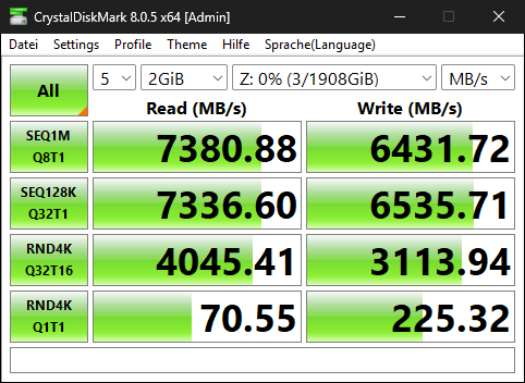 | Herstellerangabe | 7.400 MB/s | 6.500 MB/s |