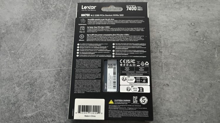 Auf der Rückseite gibt es ein paar Fakten. So schreibt der Hersteller, dass die SSD zweimal so schnell ist wie eine Gen 3 SSD. Ein weiterer interessanter Fakt ist, dass die NM790 40% weniger Strom verbraucht als PCIe Gen4 SSDs… doch die NM790 ist doch eine Gen 4 SSD, also wie kann das Sinn machen? Eventuell fehlt einfach der Verweis auf „Im Vergleich zu anderen Gen 4 SSDs“. Wir werden aber beim Hersteller nachfragen.