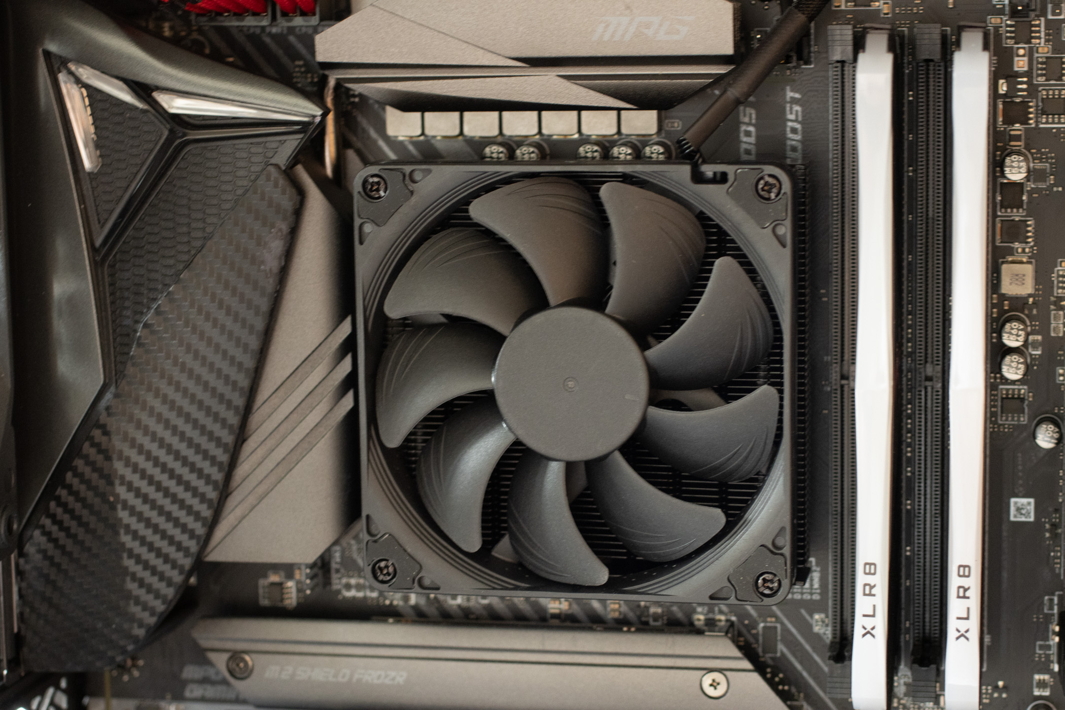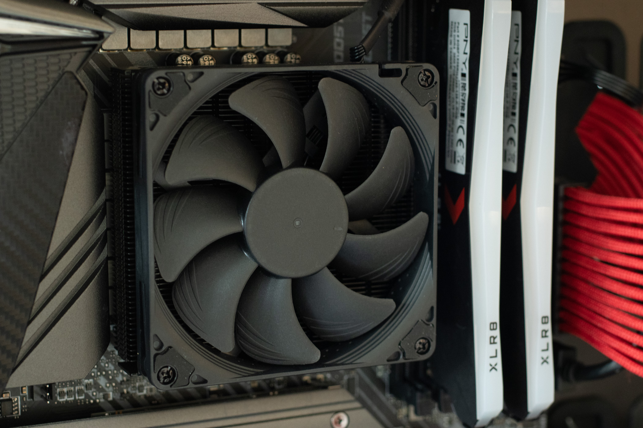 Der Noctua NH-L9i chormax.black ist sehr hochwertig verarbeitet, alle Kühlrippen sind parallel und alle Bleche vollständig entratet. Auch die schwarze Beschichtung ist gleichmäßig und fehlerfrei aufgetragen. Das Anschlusskabel könnte ruhig etwas kürzer ausgelegt sein, da es recht steif ist muss man etwas schauen wie man es ideal verlegt. In unserem Testgehäuse lässt es sich aber gut verstecken.