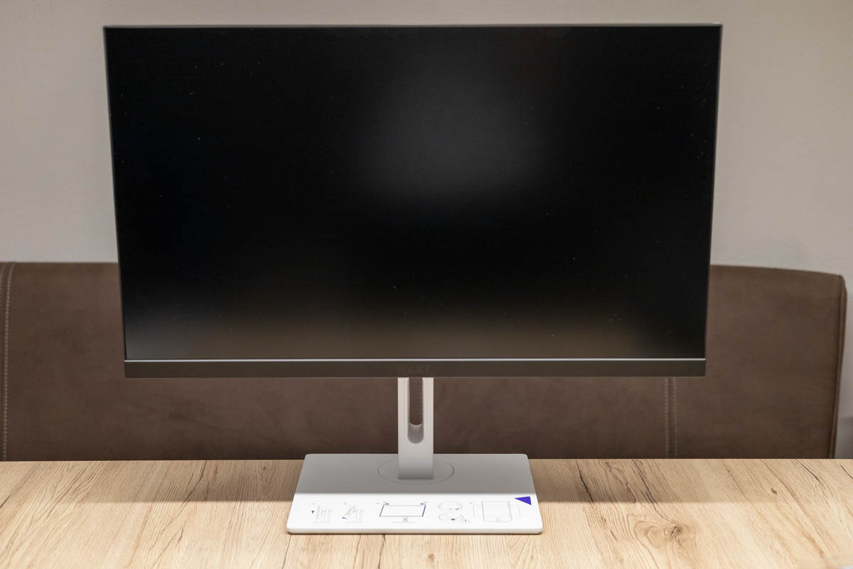 Möchte man den Monitor lieber an einem Wandhalter oder Schwenkarm befestigen, lässt man den Standfuß ab und kann die rückseitige VESA-100×100-Halterung nutzen. Diese ist leicht eingelassen, sodass man hier ggf. mit größeren Montageplatten aufpassen muss. Schrauben für die Befestigung einer Halterung sind bereits eingeschraubt. Die Anschlüsse sind alle nach unten ausgerichtet und leicht nach innen versetzt, sodass sie von hinten nicht direkt zu sehen sind. Praktischerweise sind alle Anschlüsse gut leserlich beschriftet. Die Schriften sind dabei leicht nach unten versetzt, sodass man nicht unbedingt von unten schauen muss, um den richtigen Anschluss zu finden. Ein praktisches Feature ist sicherlich der integrierte USB-HUB, der es ermöglicht bis zu zwei USB-Geräte am Monitor anzuschließen.