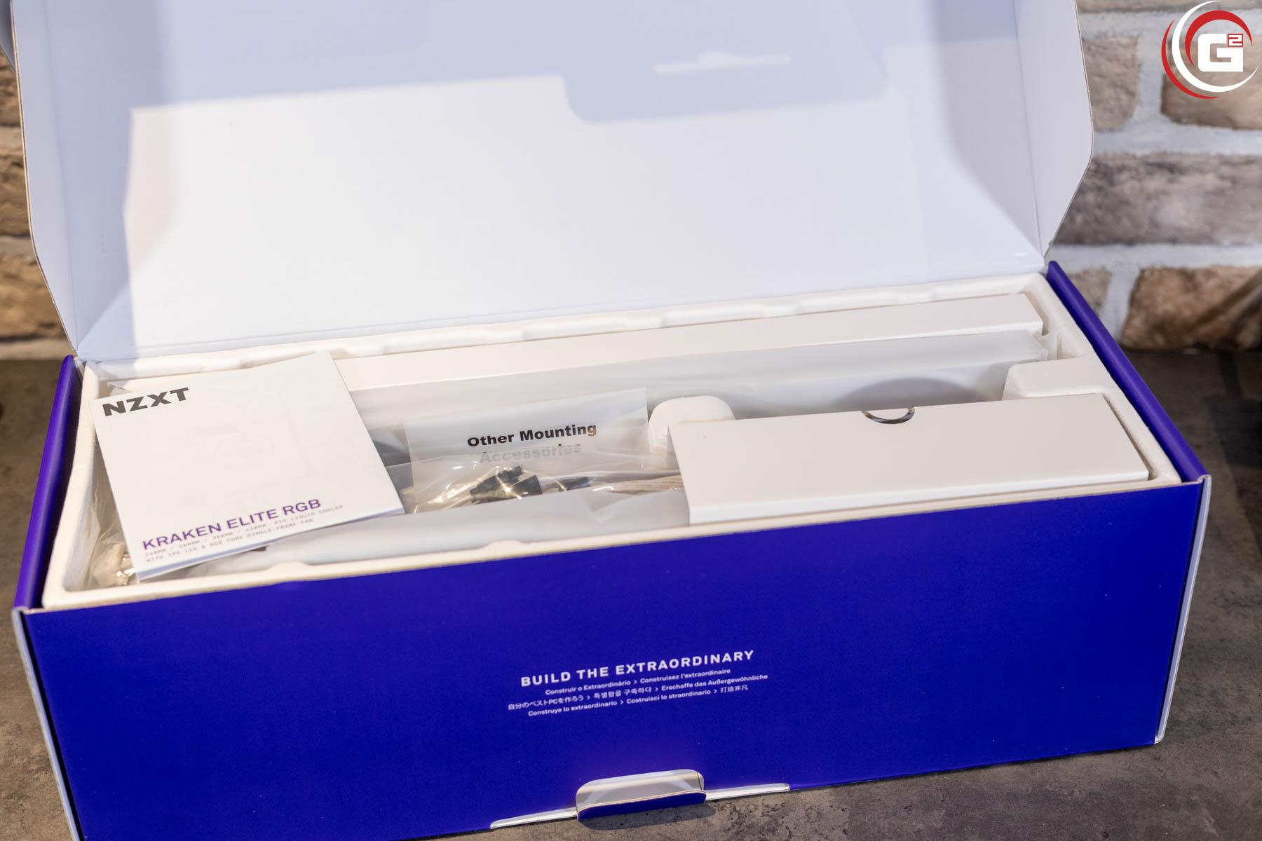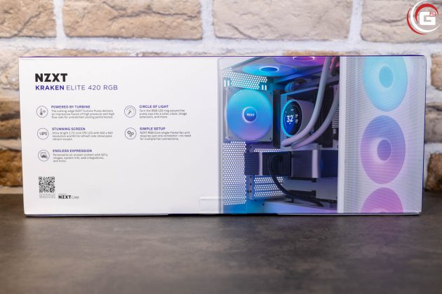 Die Umverpackung der NZXT Kraken Elite 420 RGB kommt im bekannten NZXT-Design mit weiß-lila Farbgebung. Die Vorderseite zeigt eine Abbildung der AiO an sich und die Rückseite eine Darstellung im verbauten Zustand mit einigen technischen Daten, weitere Details finden sich auf einer der kurzen Seiten.
