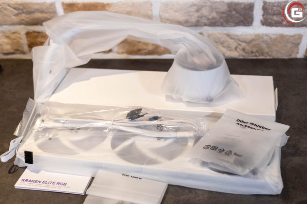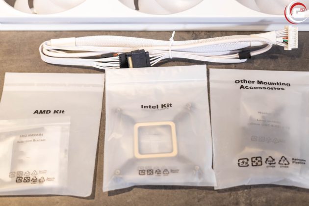 Der Lieferumfang besteht aus dem Radiator mit angebundenem Pumpenkopf, dem 420-mm-Lüfter, Verbindungskabeln und dem Montagematerial für die diversen unterstützten Sockel.