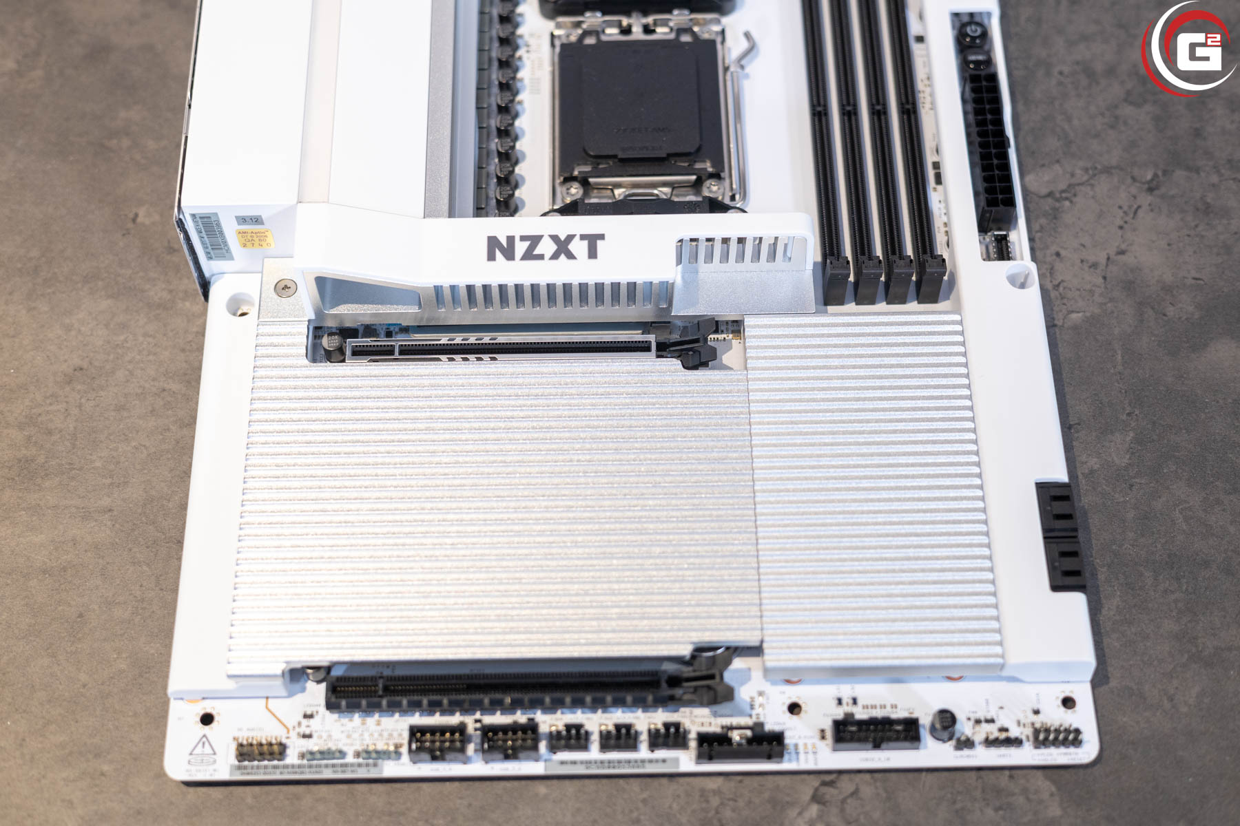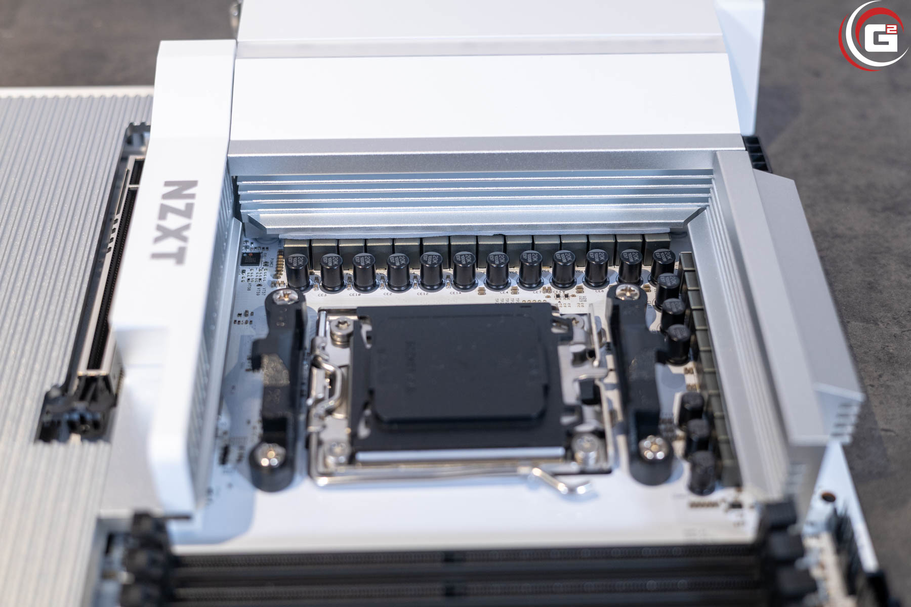 Das NZXT N9 X870E unterstützt die AMD Ryzen CPUs aus der 7000er, 8000er und der aktuellen 9000er-Serie. Die Spannungswandlung des Mainboards umfasst 20+2+1 Phasen mit 110 A SPS. Die Spannungswandler sind, wie üblich, oberhalb und links neben dem CPU-Sockel positioniert. Zur Kühlung der MOSFETs und SFCs ist ein großer Kühlblock mit Wärmeleitpads aufgesetzt. Dieser ist auf der Oberseite auch mit einer schwarzen Abdeckung versehen, die jedoch einseitig über Lüftungsöffnungen verfügt.