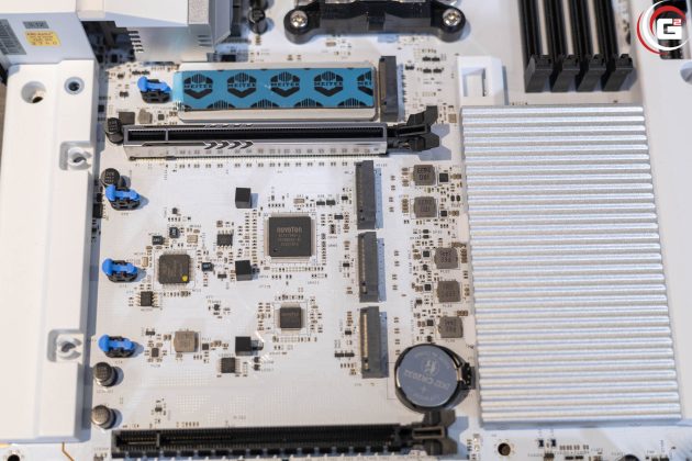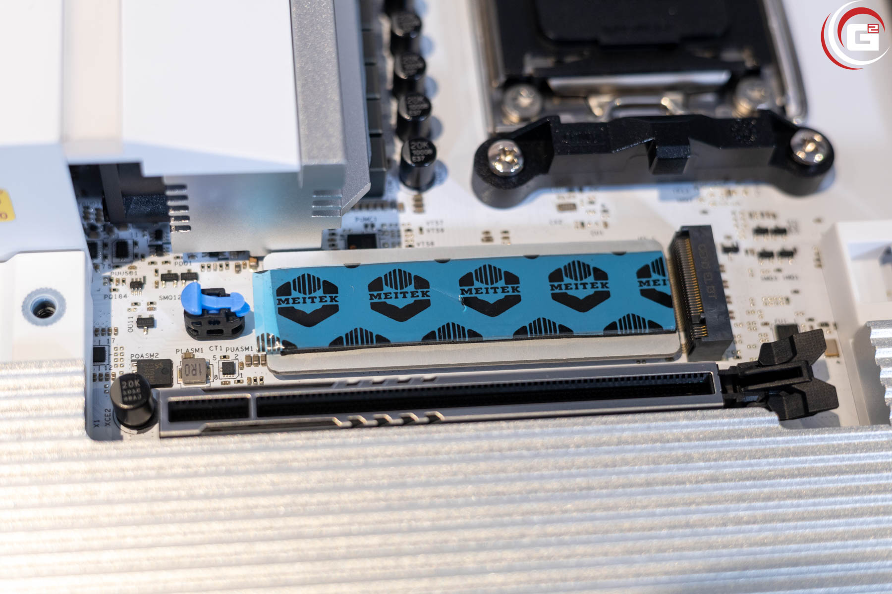 Herz des Mainboards ist der aktuelle AMD-X870E-Chipsatz. Der X-Chipsatz stellt bei AMD immer die Topline jeder Generation dar und richtet sich besonders an Enthusiasten und OC-Fans. Dahingegen stellen die B-Chipsätze die Mittelklasse und die A-Chipsätze die Einstiegsklasse dar. So besitzen die X-Chipsätze mehr PICe-Lanes und unterstützen so mehr Komponenten und verfügen über mehr USB-Anschlüsse, USB4 gehört hier zur Standardausstattung. Darüber hinaus bietet bei AMD aktuell nur der X-Chipsatz eine Unterstützung von PCIe-5.0-Grafikkarten. Insgesamt gibt es aktuell zwei X-Chipsätze, den X870 und X870E, letzterer bietet dank einer größeren Anzahl an PCIe-Lanes mehr Schnittstellen.