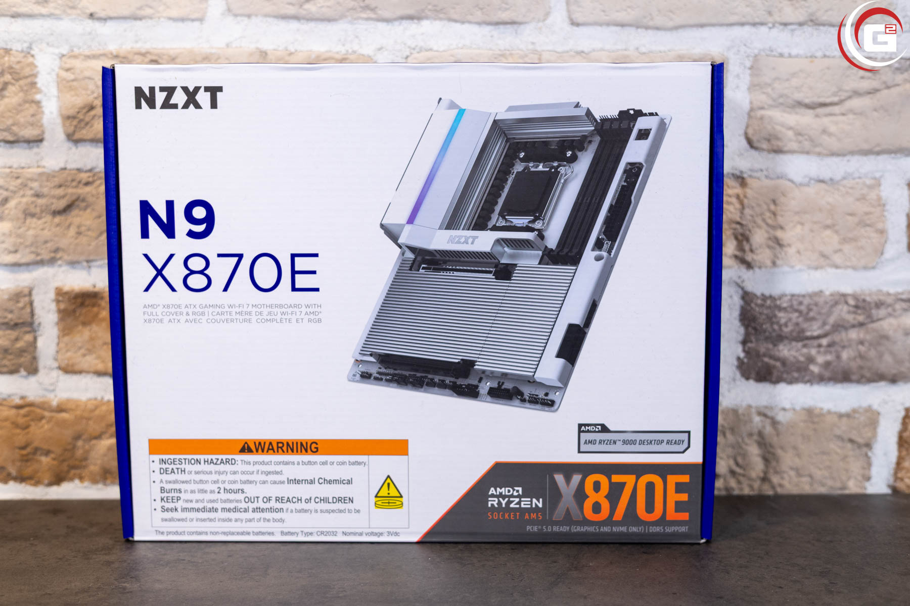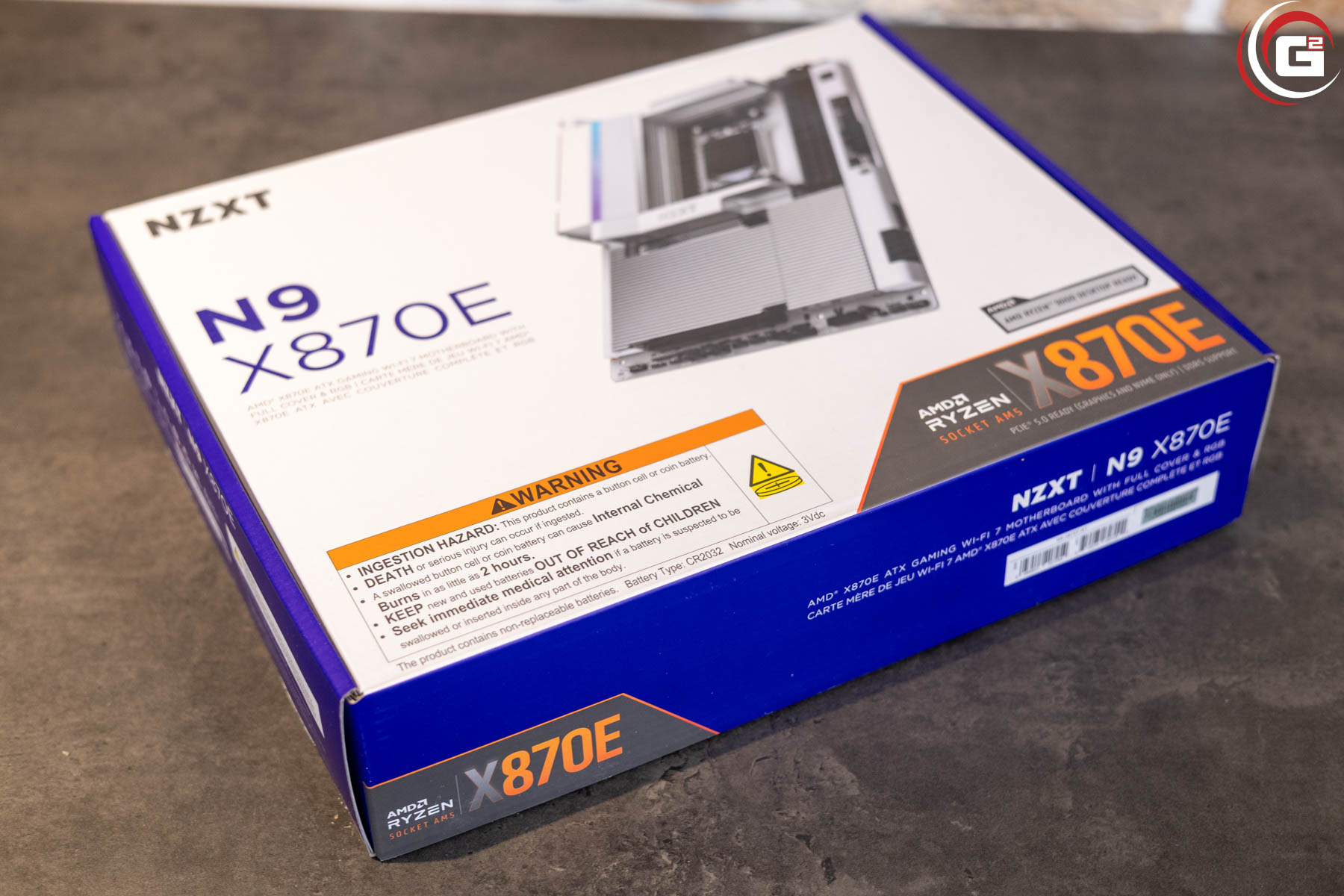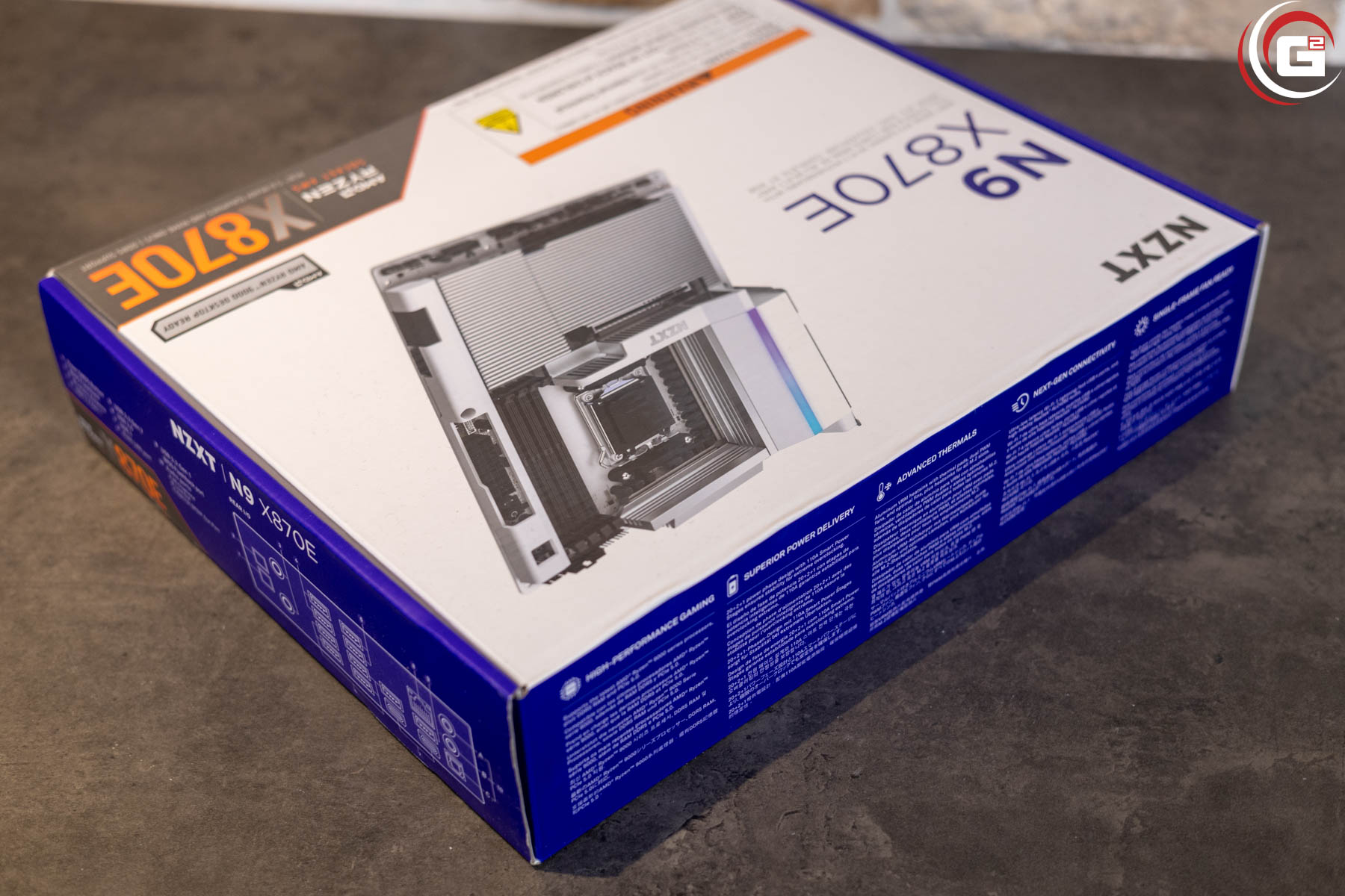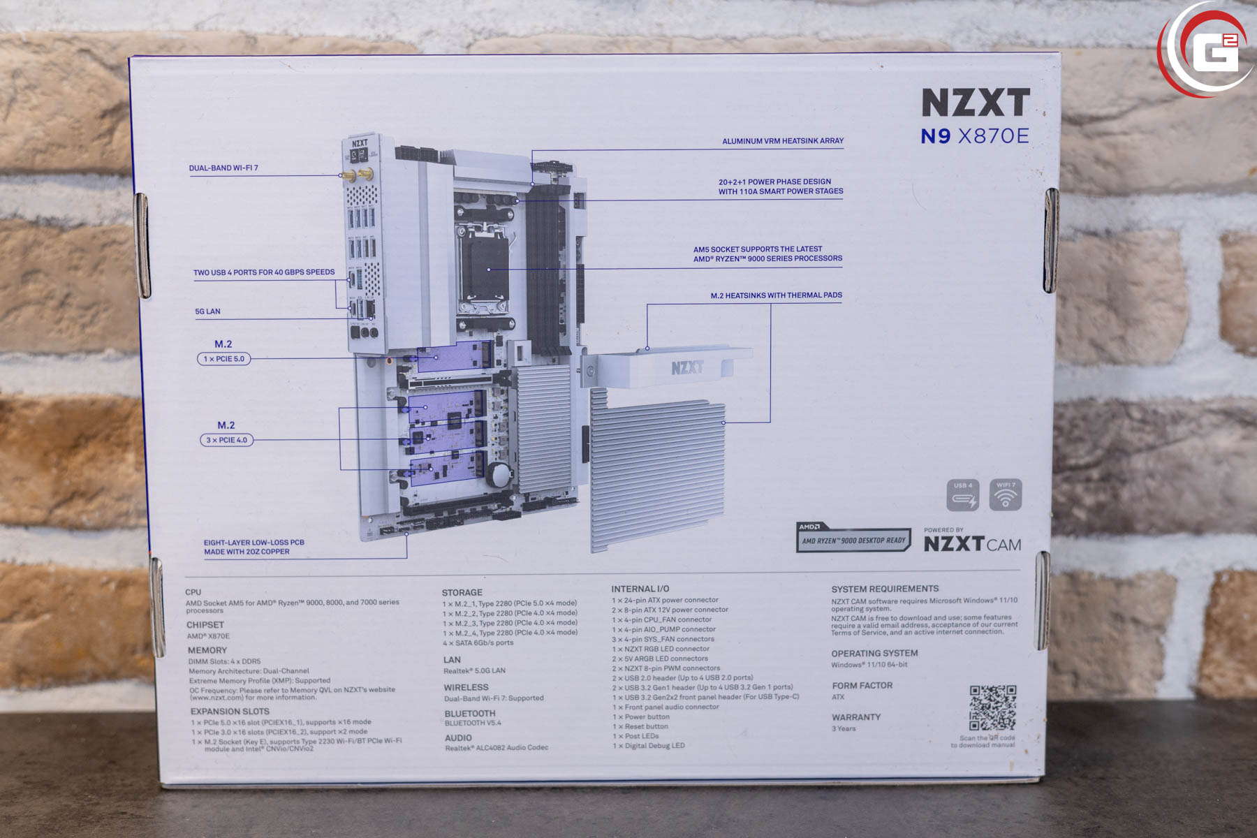 Die Umverpackung des NZXT N9 X870E besteht nun nicht mehr aus einer inneren und einer äußeren Verpackung, sondern ist als typische Mainboard-Verpackung zum Aufklappen aufgebaut. Grundfarbe ist NZXT typisch Weiß mit Lila für die Seiten. Auf der Vorderseite findet sich eine großformatige Produktabbildung und auf der Rückseite werden die technischen Details dargestellt.