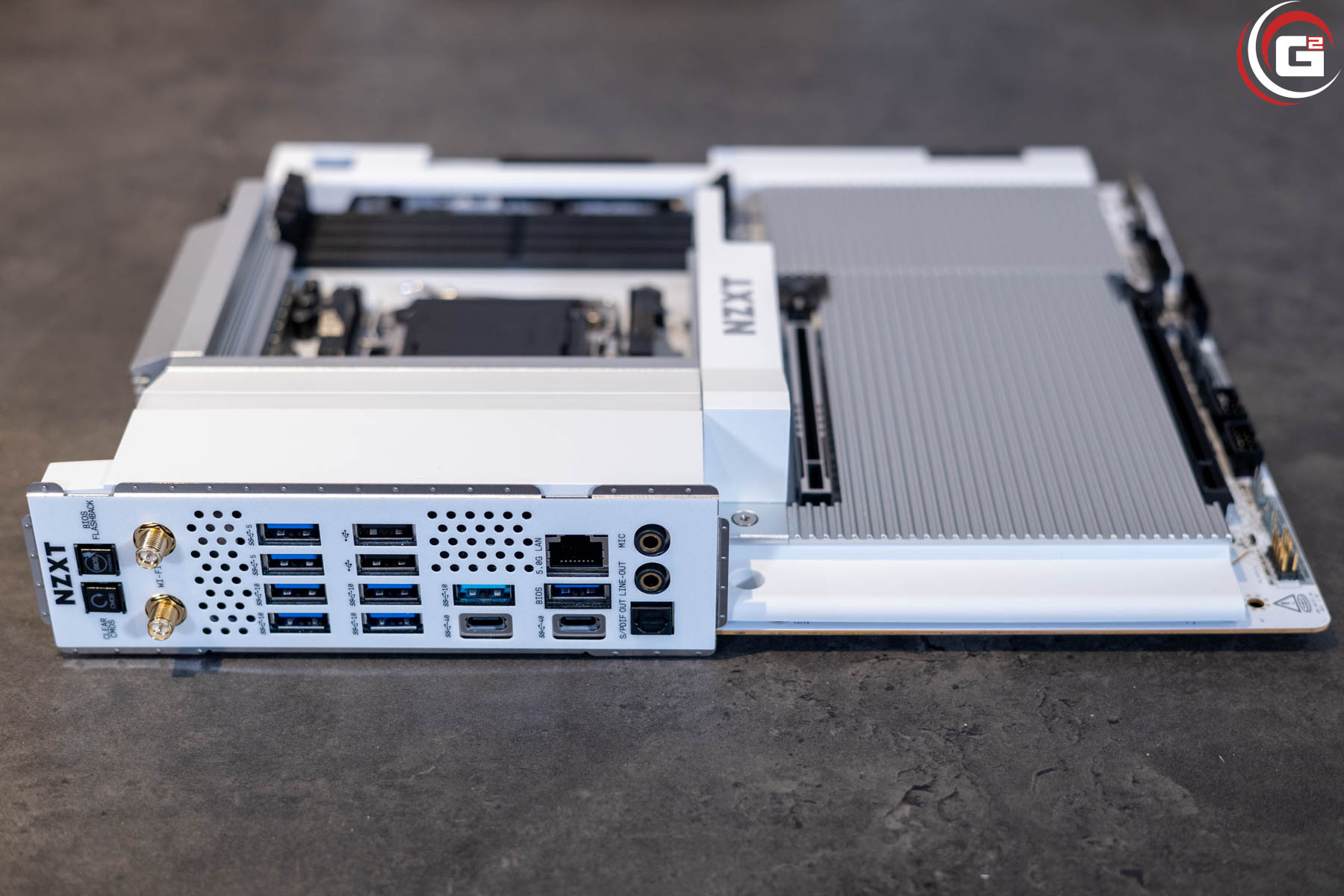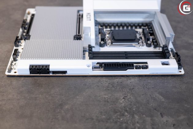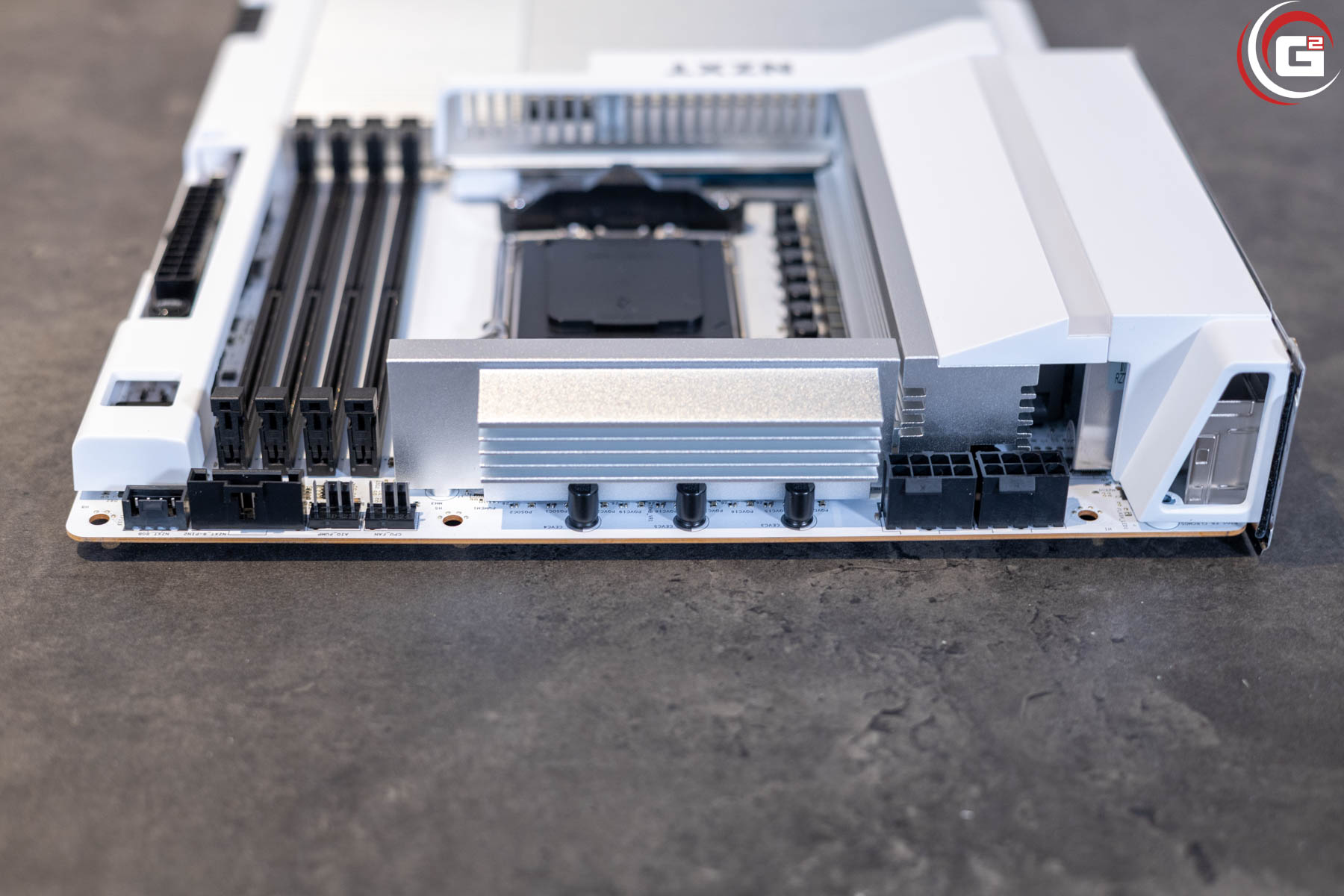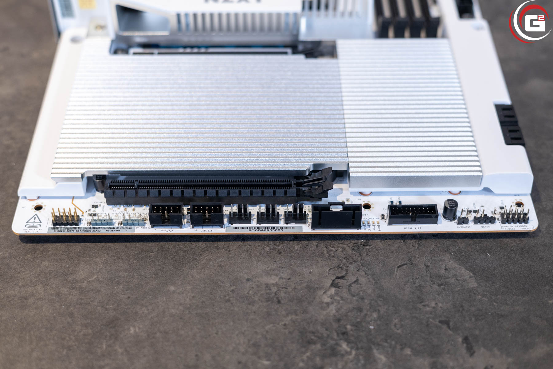 Die vier SATA-Ports und die beiden USB-3.2-Gen-1-Header sind seitlich gewinkelt angebracht, was das Kabelmanagement etwas vereinfacht. Der USB-3.2-Gen-2×2-Header ist nicht gewinkelt positioniert, ebenso der ATX-Stromanschluss. Alle weiteren Anschlüsse finden sich gesammelt an der Unter- und Oberseite des Mainboards. An der Oberseite befindet sich der proprietäre Lüfter- und RGB-Anschluss von NZXT, sowie ein klassischer Lüfteranschluss und die Anschlüsse für den CPU-Kühler und die Pumpe. Die weiteren Lüfter, RGB und USB-Anschlüsse befinden sich an der Unterseite.