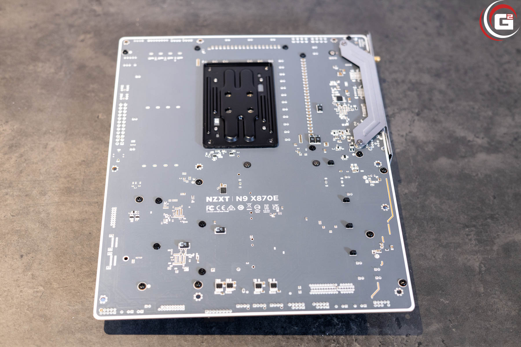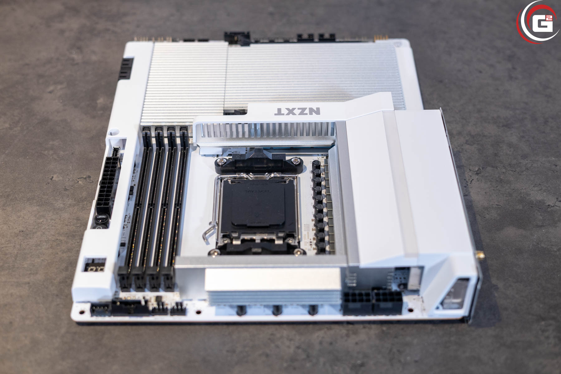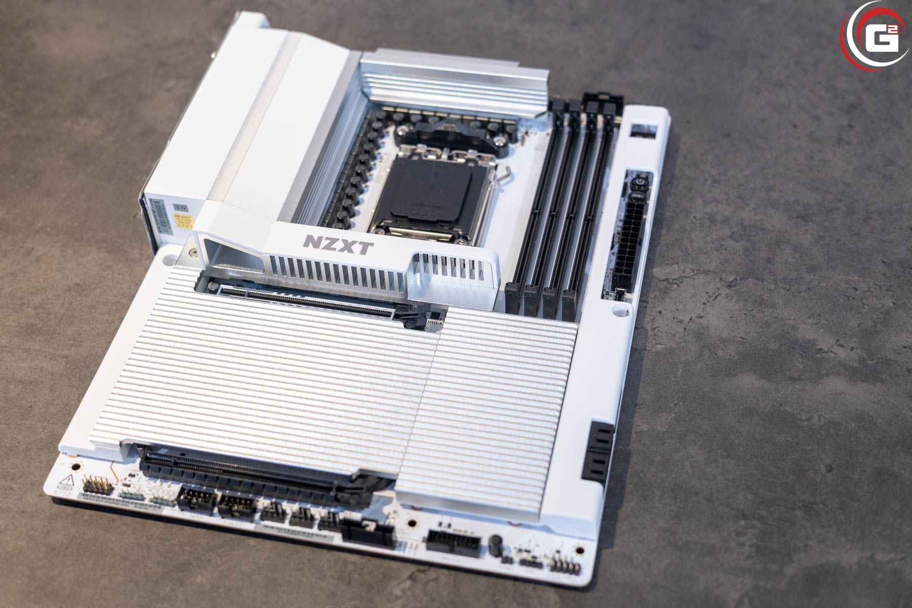 Die vier SATA-Ports und die beiden USB-3.2-Gen-1-Header sind seitlich gewinkelt angebracht, was das Kabelmanagement etwas vereinfacht. Der USB-3.2-Gen-2×2-Header ist nicht gewinkelt positioniert, ebenso der ATX-Stromanschluss. Alle weiteren Anschlüsse finden sich gesammelt an der Unter- und Oberseite des Mainboards. An der Oberseite befindet sich der proprietäre Lüfter- und RGB-Anschluss von NZXT, sowie ein klassischer Lüfteranschluss und die Anschlüsse für den CPU-Kühler und die Pumpe. Die weiteren Lüfter, RGB und USB-Anschlüsse befinden sich an der Unterseite.