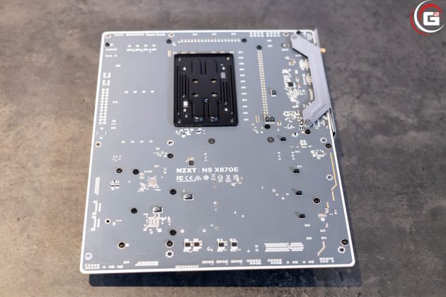 Optisch bleibt sich NZXT weiterhin treu, und auch das N9 Z890 folgt dem klaren und eleganten Design von NZXT. Die Unterschiede zur Vorgängergeneration fallen dieses Mal tatsächlich deutlich größer aus, denn eine ARGB-Beleuchtung findet Einzug und der Bereich der m.2-SSDs ist nun nicht mehr mit einfachen Abdeckungen, sondern einem strukturierten Kühlkörper versehen. Zudem ist bei der weißen Version nun auch das PCB in Weiß gehalten, dafür ist der Kühlkörper der SSDs in blankem Aluminium ausgeführt. Dennoch bleibt die klare, aufgeräumte Optik erhalten. Die rechte Seite des Mainboards verfügt über eine Verblendung aus weißem Kunststoff mit Öffnungen für die Anschlüsse und einer eingelassenen Segment-LCD-Anzeige. Der Bereich des IO-Shields und der Spannungswandler sind mit einer weißen Blende versehen, unter der sich der fein gerippte Kühlkörper der Wandler befindet. Auch der obere m.2-SSD-Slot mit PCIe-Gen5-Anbindung besitzt einen großzügigen Kühlkörper, der so geformt ist, dass er einen fließenden Übergang zum IO-Shield besitzt. Unter der Abdeckung des IO-Shields befindet sich zudem ein kleiner Lüfter zur aktiven Kühlung der Wandler. Die Rückseite des Mainboards besitzt zwar keine Backplate, ist aber elegant in Grau gehalten.