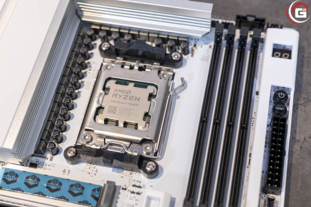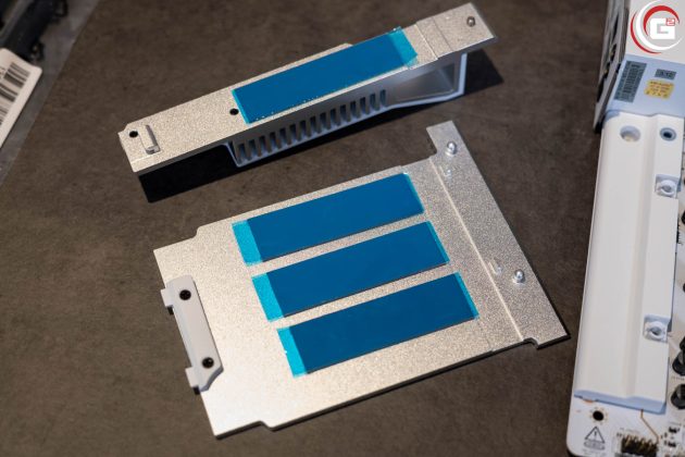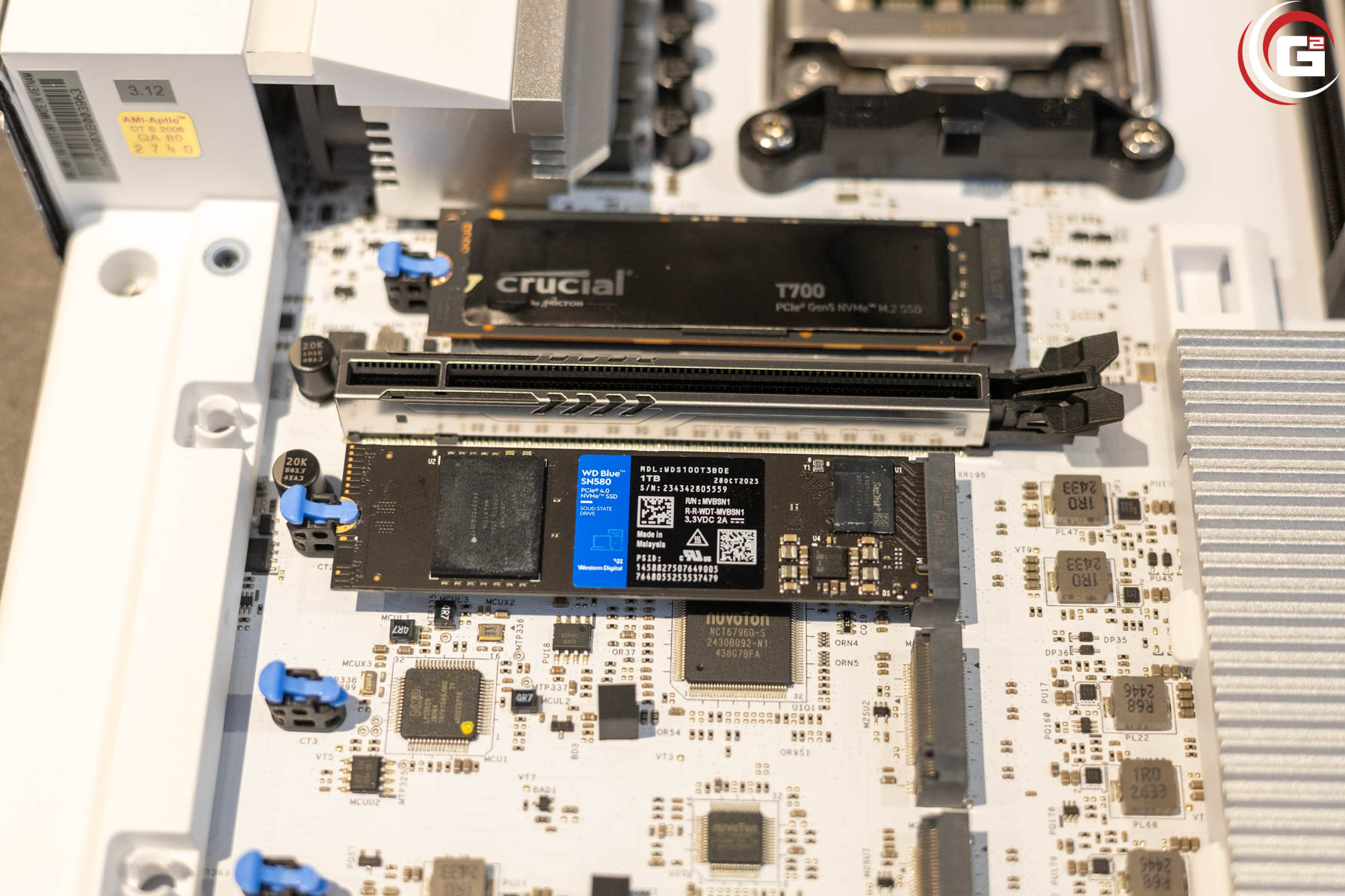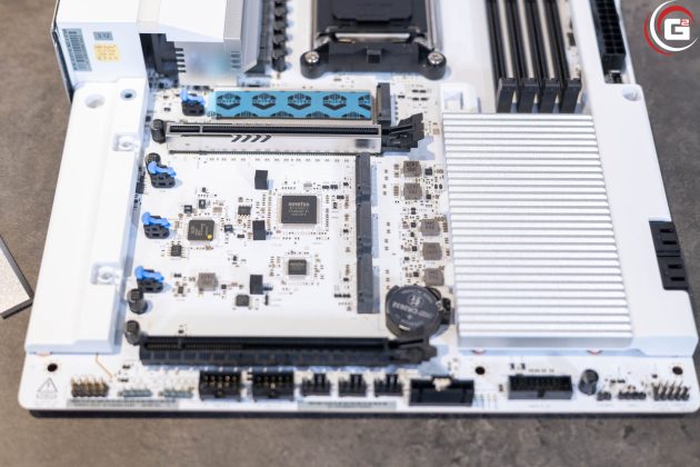Um an die obere SSD zu kommen, muss man zwei Schrauben am Kühlkörper lösen. Die große Abdeckung der unteren SSDs ist einfach nur festgedrückt und lässt sich mit etwas Kraftaufwand abnehmen. Anders als beim N9 Z890 müssen die m.2-SSDs nicht verschraubt werden, sondern können mit Cliphalterungen befestigt werden. Für die Kühlung der obere PCIe-Gen5-SSD gibt es auch ein Wärmeleitpad für die Unterseite der SSD. Bei den unteren drei PCIe-Gen4-SSD-Slots gibt es jeweils nur ein Wärmeleitpad an dem Kühlelement für die Oberseite. Die SSDs werden von unten mit Gummipuffern gestützt.