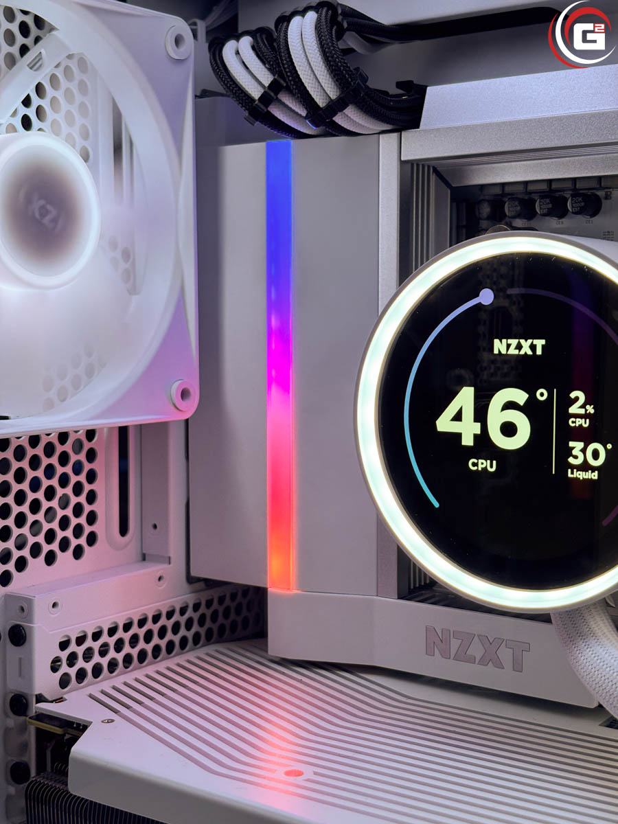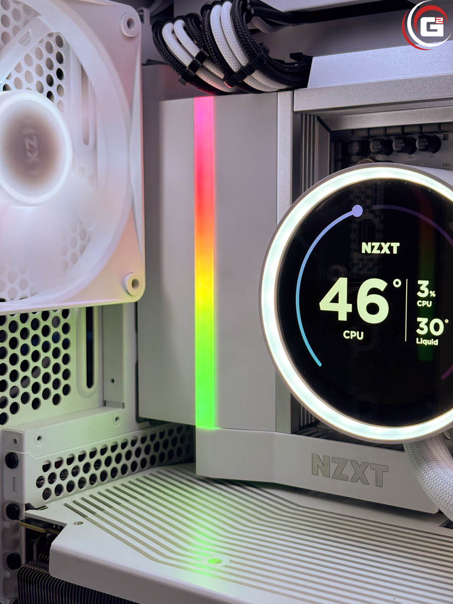 Ein besonderes optisches Detail des Mainboards ist der ARGB-Streifen, der in die Abdeckung des IO-Shields eingelassen ist. Dank einer feingliedrigen Abstufung ergibt sich hier ein sehr fließender Farbübergang. Mittels NZXT CAM kann man zum einen Presets hinterlegen, aber auch jede LED einzeln ansteuern. Eine Integration der Beleuchtung an dieser Stelle ist sehr passend, da sie so nicht von der Grafikkarte verdeckt wird.