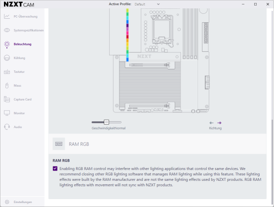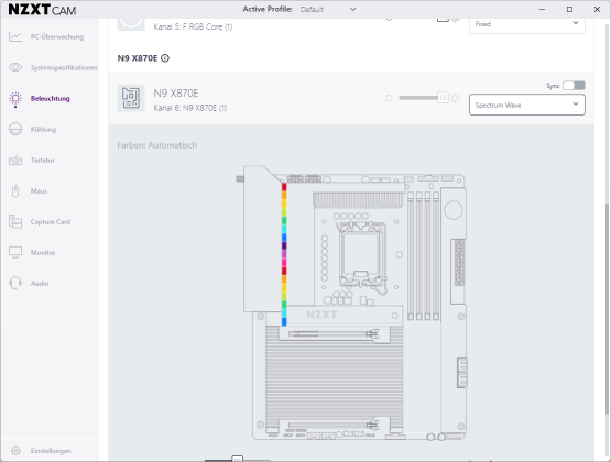 Besonders relevant für die Mainboard-Steuerung sind die Tabs „Beleuchtung“ und „Kühlung“. Im Beleuchtungsbereich können die LED-Ports des Mainboards individuell konfiguriert werden. Wer 5V-ARGB-Geräte betreibt, muss hier unter den erweiterten Optionen die korrekte LED-Anzahl festlegen, um eine optimale Darstellung der Effekte zu gewährleisten. Dabei steht eine breite Palette an voreingestellten Effekten zur Verfügung – von statischen Farben bis hin zu aufwendigen Animationen. Die große ARGB-Zone des Mainboards kann man hier sehr feinstufig mit Effekten belegen, vom statischen Licht bis hin zu feingliedrigen Lauflichteffekten. Im Kühlungs-Tab können separate Lüfterkurven für die verschiedenen Anschlüsse des Mainboards erstellt werden. Besonders praktisch: Die Lüfterdrehzahlen lassen sich nicht nur anhand der CPU-Temperatur regulieren, sondern auch abhängig von der GPU-Temperatur. Wer eine Kraken-Wasserkühlung nutzt, kann sogar die Wassertemperatur als Steuergröße einbinden. Da das Board für die VRMs über einen kleinen Lüfter unterhalb der Abdeckung verfügt, kann man auch dessen Drehzahl anpassen. Allerdings kann man die Temperatur der VRMs nicht als Steuergröße nutzen, auch hier kann man auf die CPU-, GPU- und Wassertemperatur zurückgreifen.
