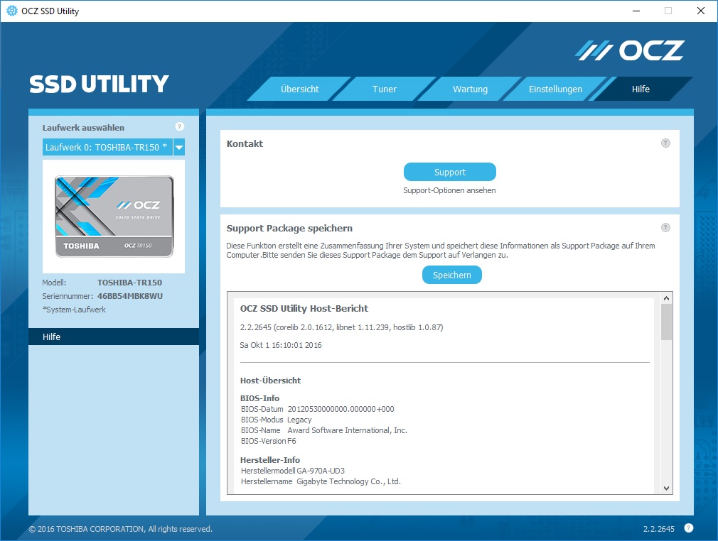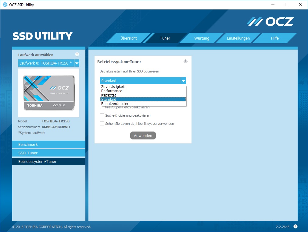 Aber auch ein Tuner ist vorhanden, mit dem sich das installierte Betriebssystem für den optimalen Betrieb mit der SSD optimieren lässt. Dabei sind verschiedene Optimierungsmodi möglich. Außerdem kann über das Tool auch der technische Support von OCZ eingeschaltet werden. Über diese Option können Techniker von OCZ mittels Host-Bericht schnell handeln und beispielsweise direkt eine neue SSD zum Austausch losschicken.