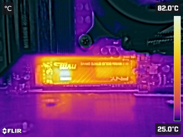 Bei der SSD lassen sich zwei unterschiedliche Temperaturen auslesen, die allerdings durchgängig identisch sind. Vermutlich wird es sich hierbei um den Controller handeln. Maximal wird eine Temperatur von 80 °C erreicht, danach wird über ein Drosseln ein sofortiger Abfall der Temperatur erreicht. Ohne Kühlkörper haben wir die maximalen Temperaturen nach wenigen Durchläufen vom SEQ1M-Q8T1-Test von CrystalDiskMark erreicht. Man sollte die SSD immer mit einem Kühlkörper betreiben.