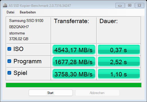 AS SSD bietet auch ein Kopierbenchmark, dieser überprüft das Verschieben von Daten auf der NVMe. Hierbei werden drei Szenarien getestet: ein Transfer einer ISO-Datei (zwei große Dateien), eines Programms (kleine Dateien) und eines Spiels (große und kleine Dateien).