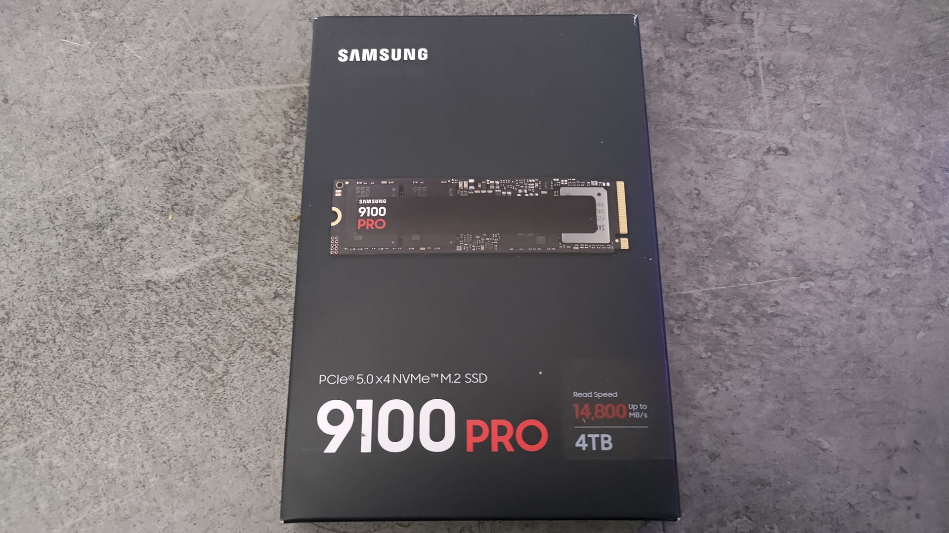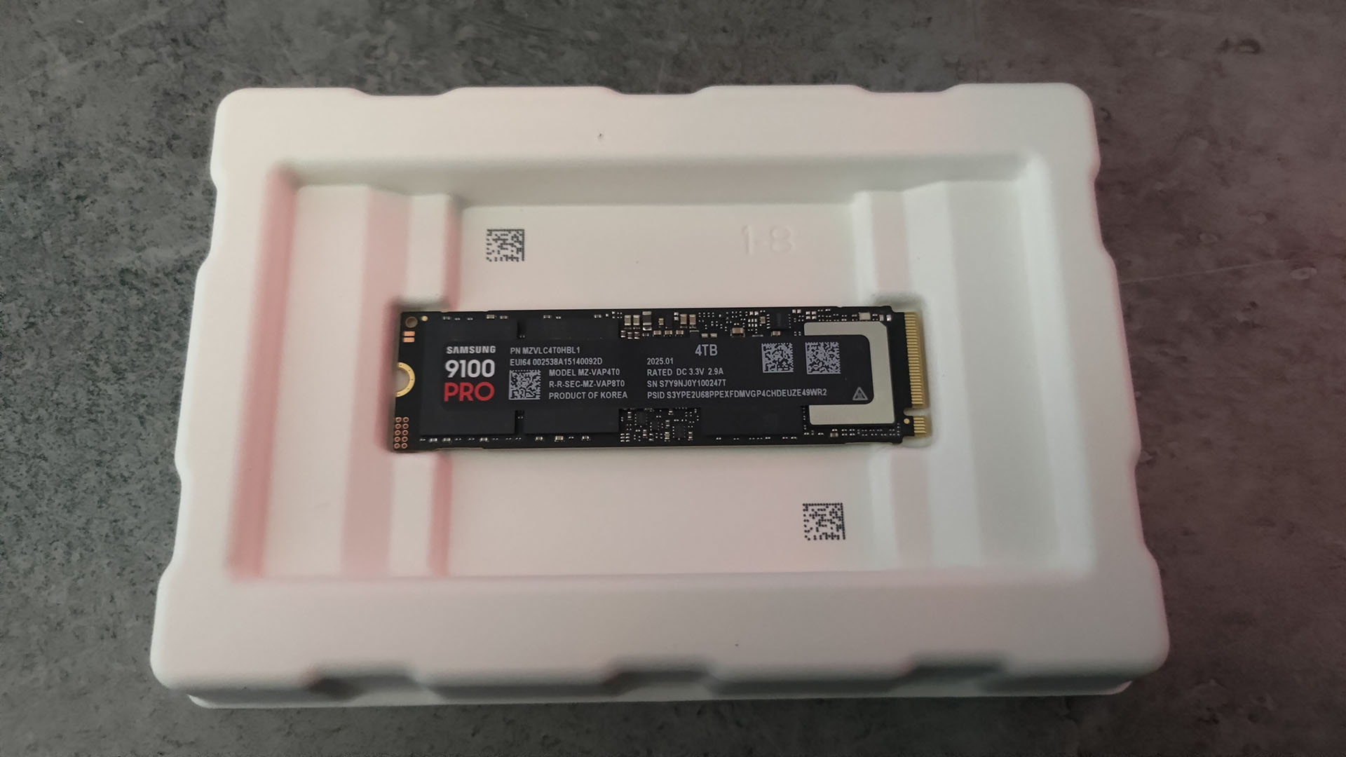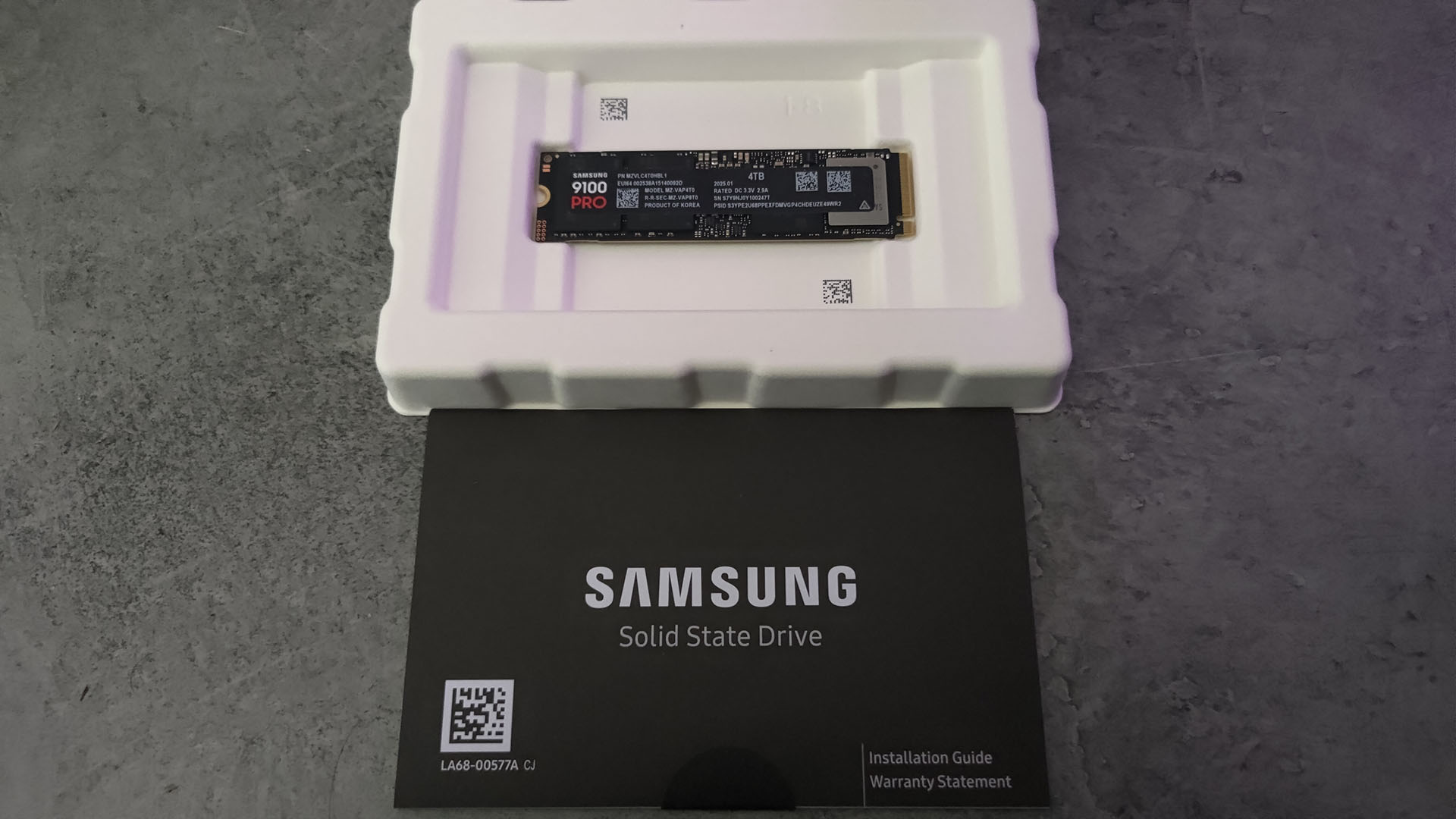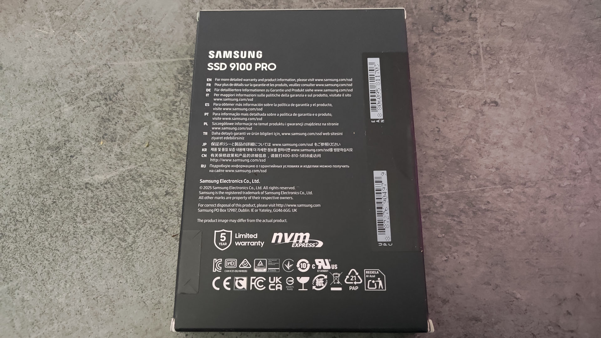 Die Verpackung hinterlässt auf den ersten Blick einen sehr hochwertigen Eindruck. Auf der Vorderseite sind neben der Modellbezeichnung auch die Speicherkapazität angegeben – in unserem Fall handelt es sich um die 9100 Pro mit 4TB.